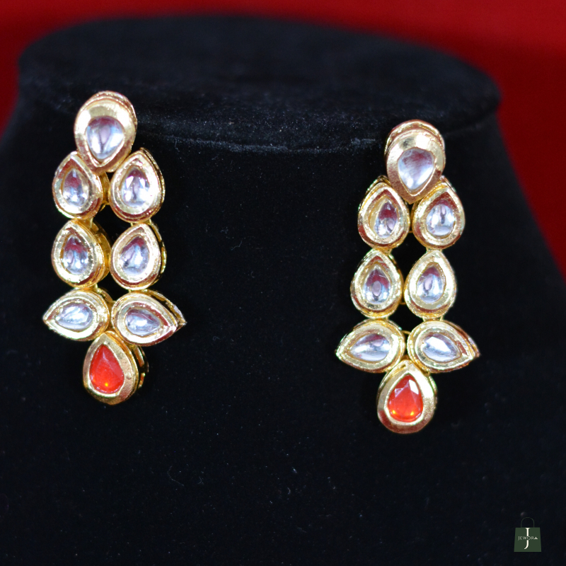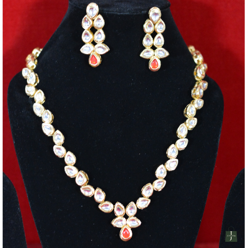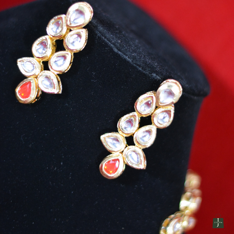 This Designer Kundan Necklace Set is highlighted with striking red accent stones that add depth and richness to its design. The polished finish and precise stone placement create a luxury-inspired look, making it a beautiful choice for bridal functions and festive events without the heaviness of high-cost jewelry.