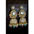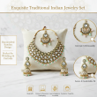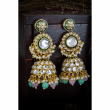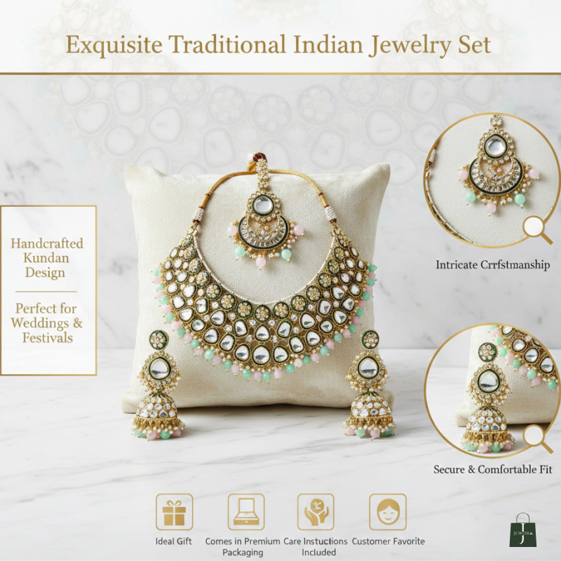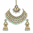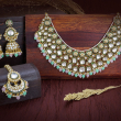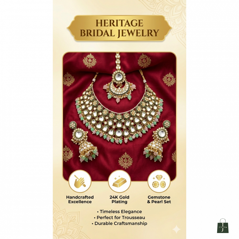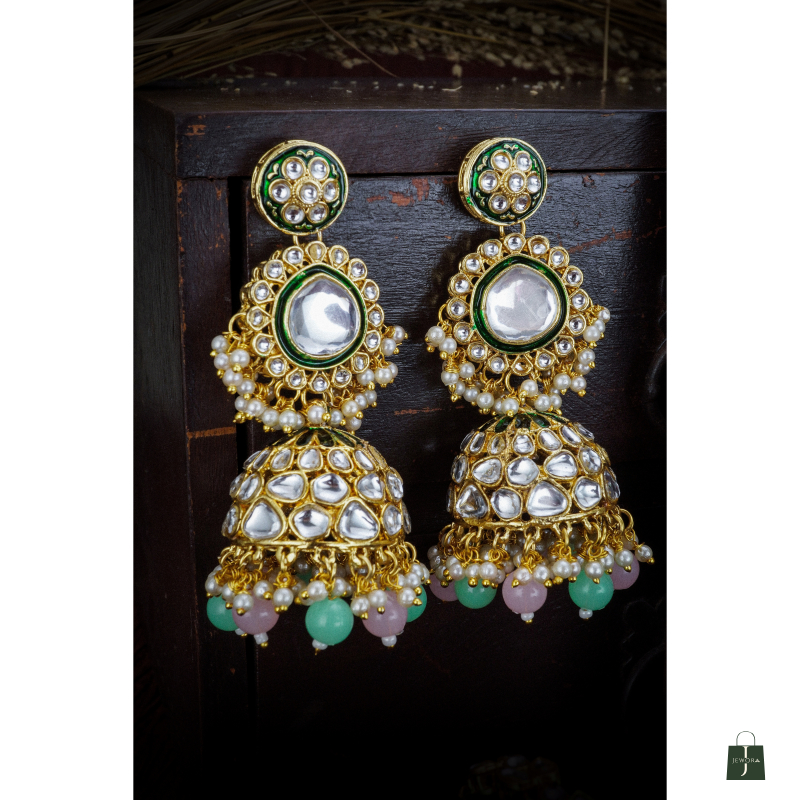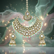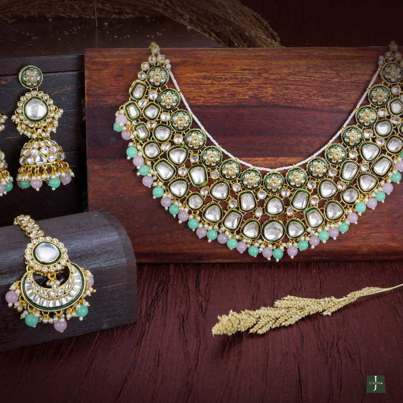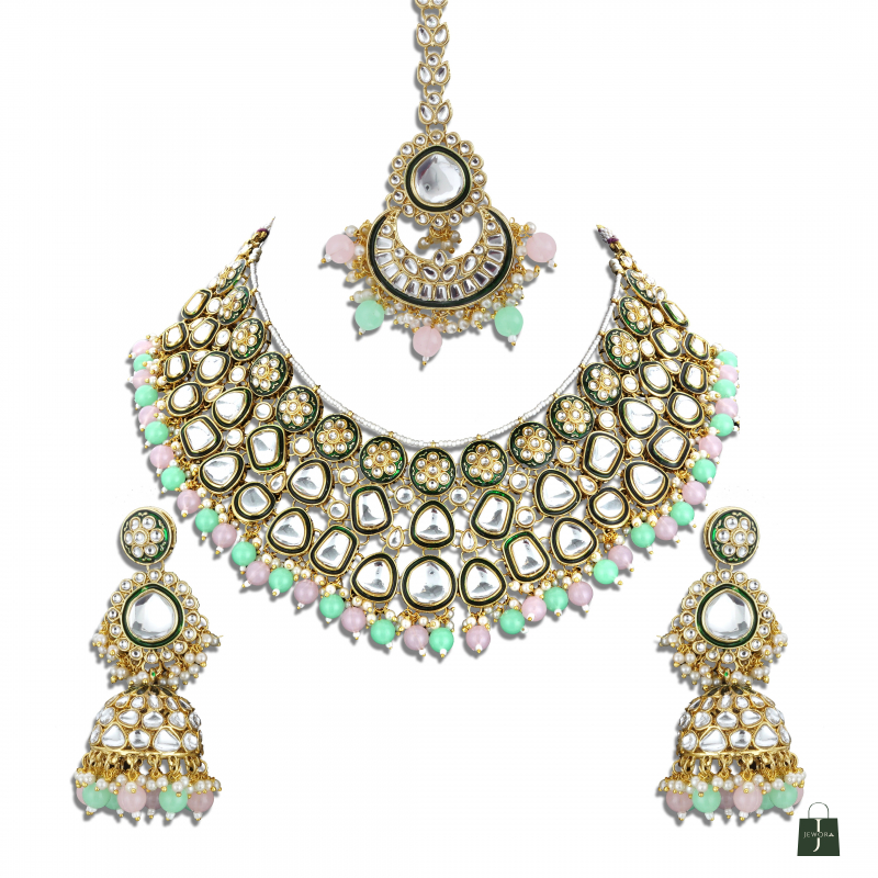Premium Moissanite Polki Brilliance: Unlike standard glass stones, this set features high-grade Moissanite Kundan. Each stone is precision-cut to capture and reflect light with a diamond-like fire, ensuring you stand out under any lighting. Artisanal Hand-Painted Meenakari: The edges of each Kundan unit are adorned with intricate, hand-applied forest green enamel (Meenakari). This traditional technique adds a layer of depth and luxury usually reserved for high-end boutique jewelry.
