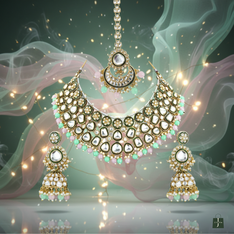 The "Sorbet" Bead Palette: Hand-strung with premium pastel mint and dusty rose hydro-beads. These matte-finish "sorbet" tones provide a modern, refreshing contrast to the gold-plated base, making it perfect for both day and night weddings. Statement 3-Piece Ensemble: This set includes a heavy-set bib choker, grand Jhumka earrings, and an oversized Chandbali Maang Tikka. The Maang Tikka is a masterpiece on its own, designed to frame the face with royal elegance.