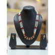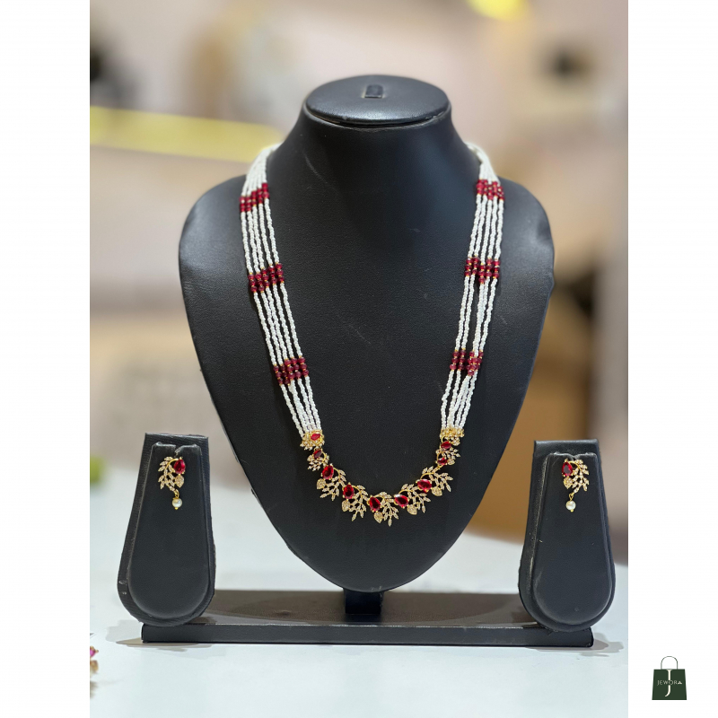 Grace your traditional look with this elegant multi-layered pearl necklace set, featuring delicate strands of white pearls accentuated with clusters of ruby-red beads. The centerpiece is adorned with intricately designed gold-tone motifs embedded with red stones, giving it a sophisticated and royal charm.