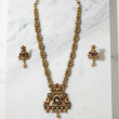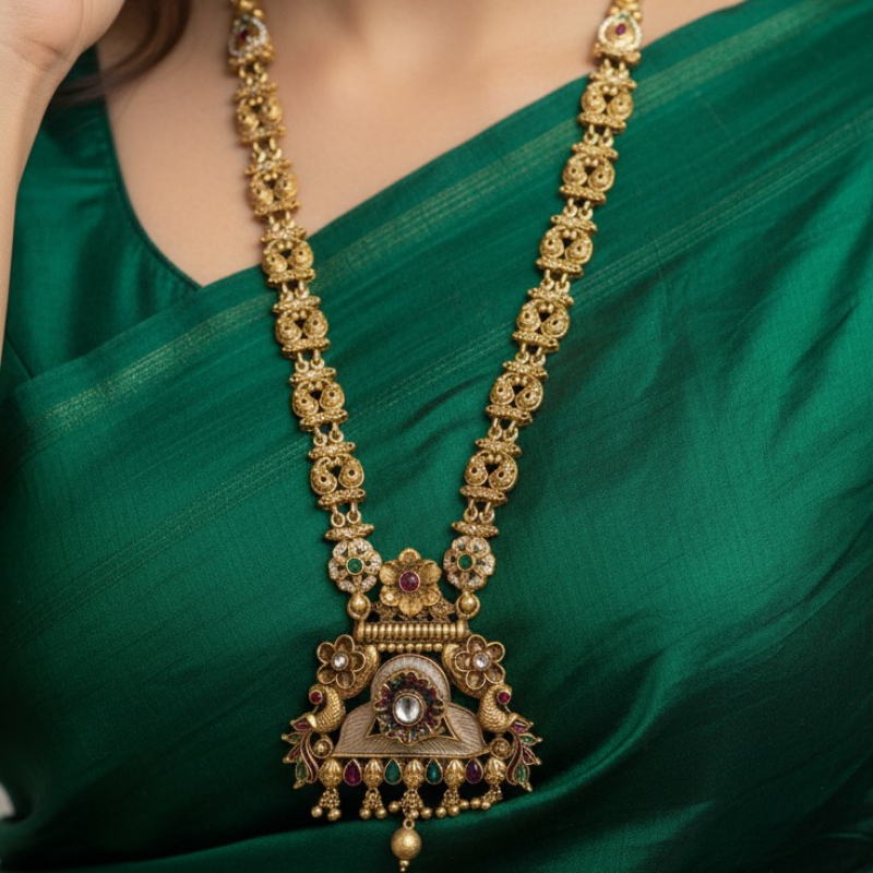 Embrace timeless elegance with the Devyani Royal Temple Long Haram Set, a masterpiece inspired by South Indian temple artistry. This long haram features intricately carved circular motifs linked gracefully to create a regal silhouette. The grand statement pendant showcases detailed peacock-inspired carvings, highlighted with vibrant stones and delicate bead danglings. Paired with matching traditional stud earrings, this set is perfect for brides and festive occasions where heritage meets grandeur.