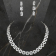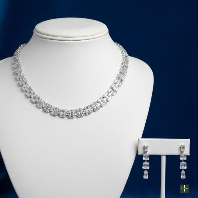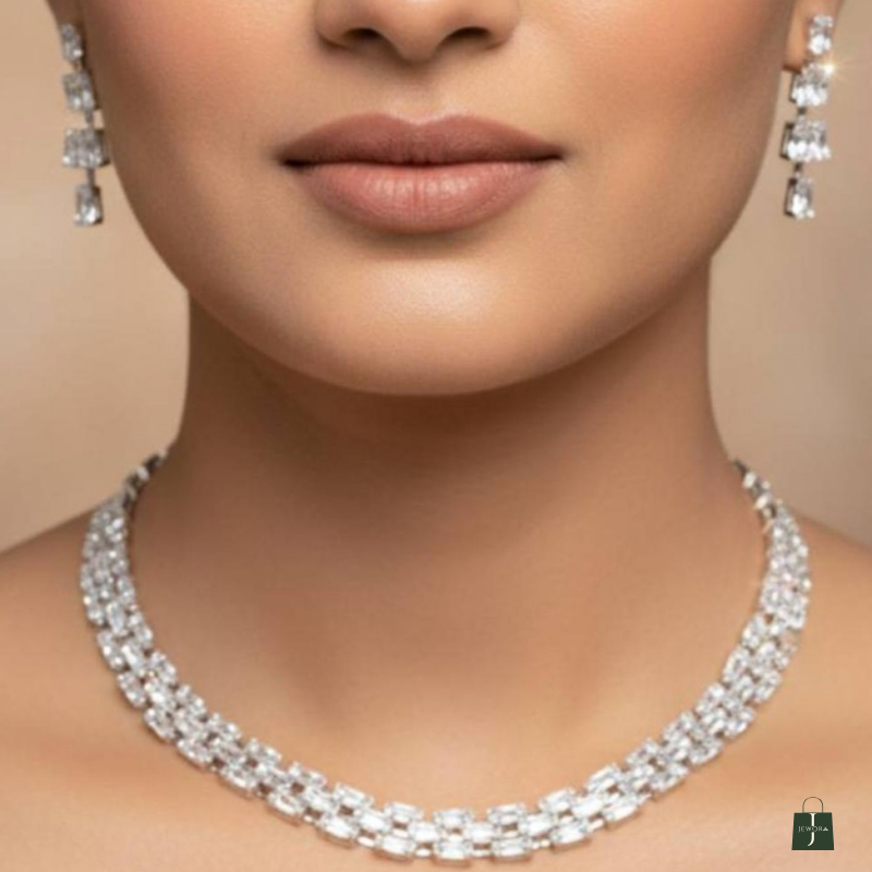 Radiate sophistication with this Diamond Glow Elegance Necklace Set. Designed with a refined and modern aesthetic, this stunning choker-style necklace features multiple rows of sparkling stones arranged in a sleek, structured pattern. The brilliant shine is complemented by matching drop earrings that add graceful movement and elegance. Perfect for brides, receptions, cocktail evenings, and formal celebrations, this set delivers timeless luxury with contemporary charm.