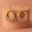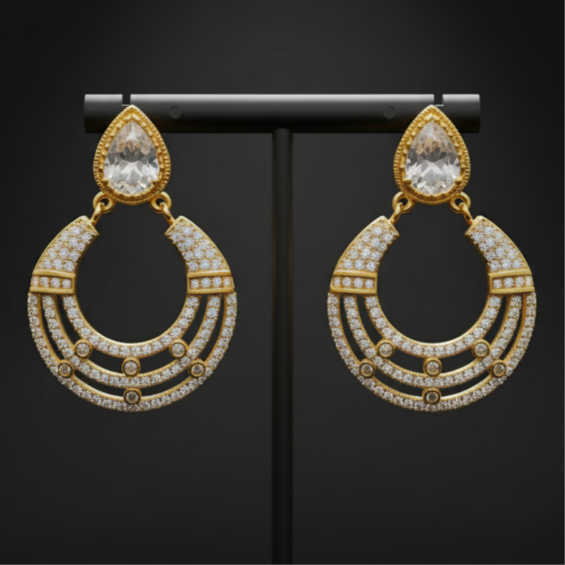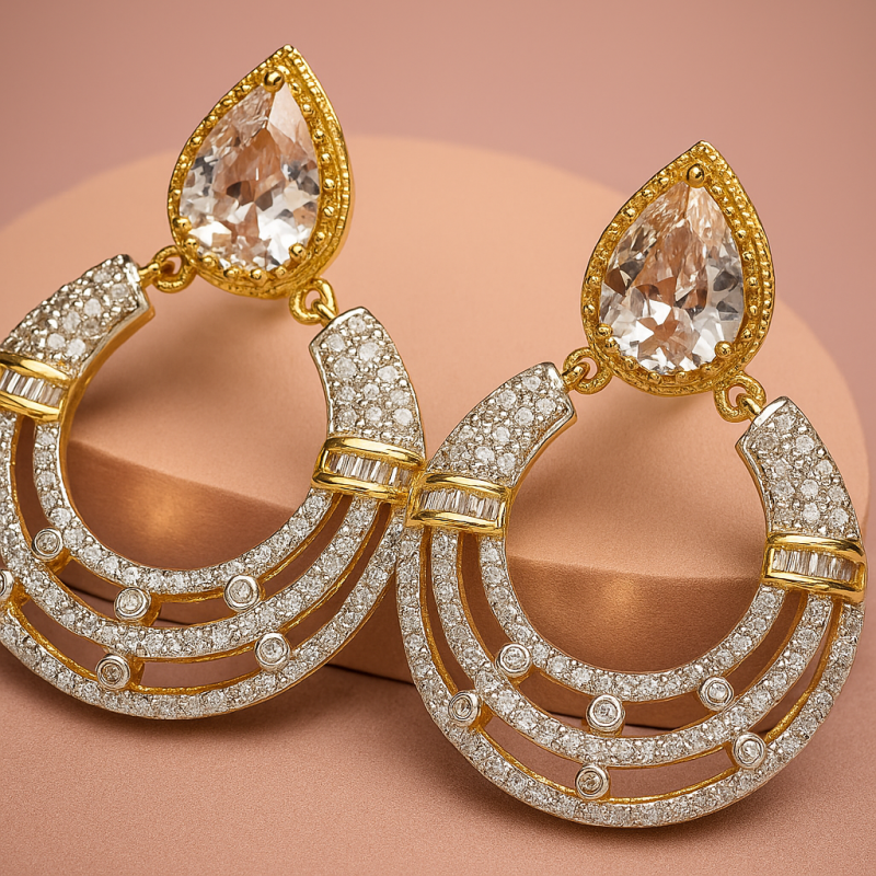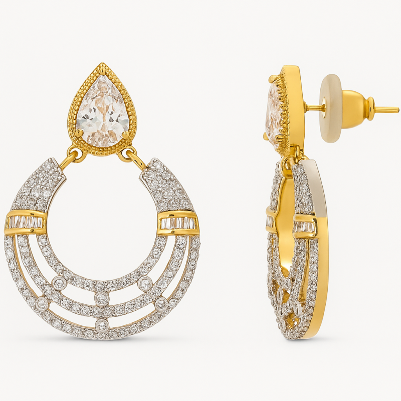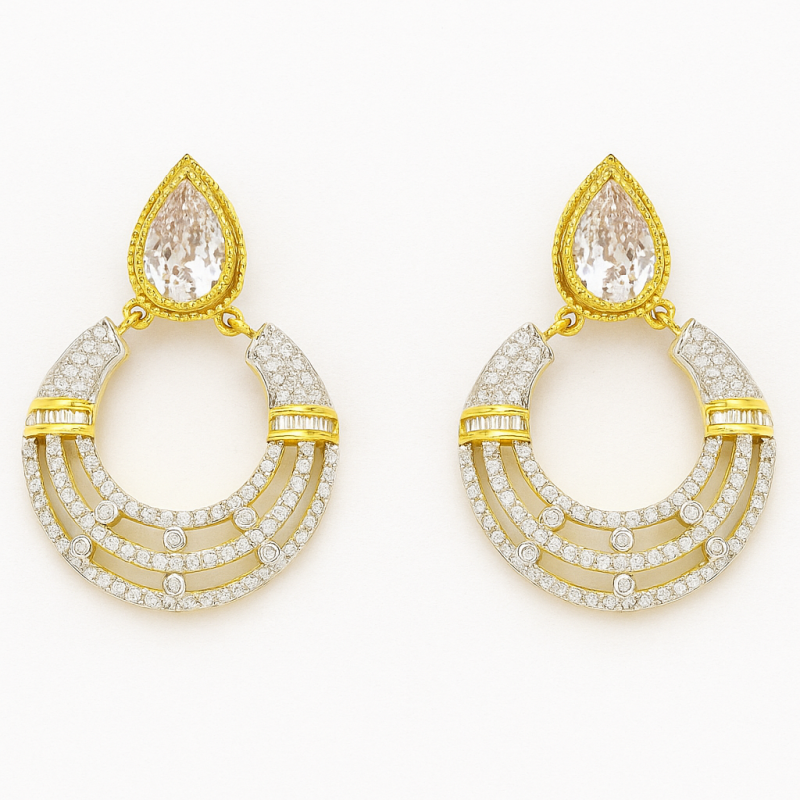 Elevate your elegance with these stunning Diamond-Studded Circular Drop Earrings. Designed with a luxurious teardrop stud top that beautifully holds a circular multi-row hoop, these earrings are encrusted with shimmering American diamonds. The blend of silver and gold tones gives a modern yet regal touch, making them perfect for weddings, festive events, or glamorous evening parties. Lightweight yet statement-making, these earrings pair effortlessly with both traditional sarees and contemporary gowns. Whether you’re attending a grand function or a special dinner, these earrings add sparkle and sophistication to your style. A timeless addition to every woman’s jewelry collection, crafted for those who love to shine with grace.