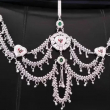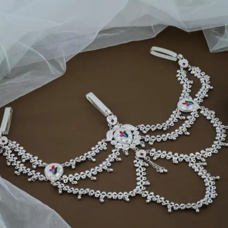 This graceful oxidised silver kamarbandh features beautifully crafted heart-shaped motifs connected with delicate layered chains. The central heart pendant is intricately detailed with subtle enamel accents, while multiple chain layers with tiny ghungroo-style drops create a charming cascading effect. The symmetrical design enhances the waistline elegantly and adds traditional flair to any outfit. Perfect to pair with sarees, lehengas, and festive attire, this kamarbandh brings a romantic yet ethnic touch to your look.