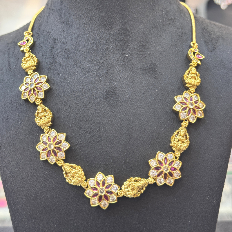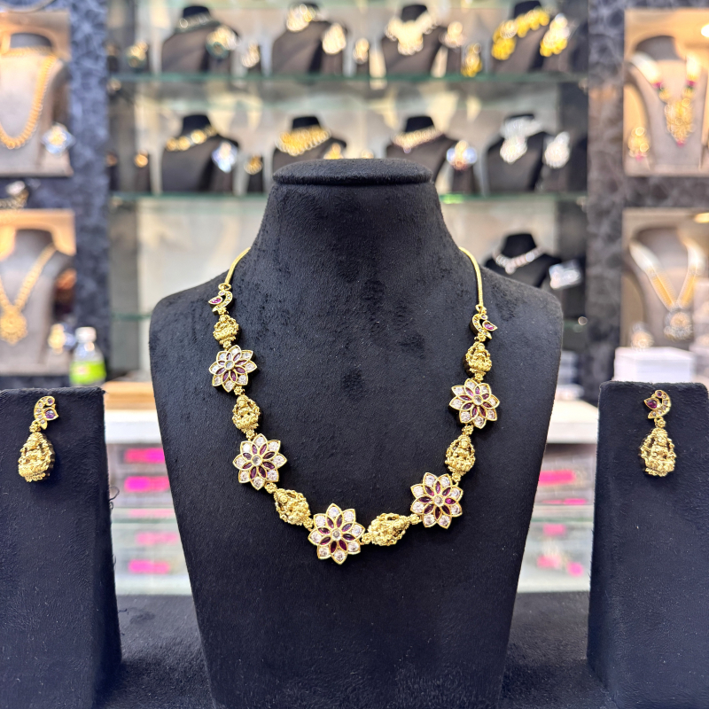 Adorn yourself with the Divine Floral Temple Necklace Set by Jewora, a masterpiece of traditional craftsmanship and elegance. Featuring intricately designed floral motifs embellished with ruby red and emerald green accents, this set beautifully blends heritage with regal charm. Each flower is outlined with sparkling white stones, adding a radiant brilliance to the design.