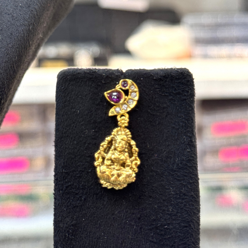 The necklace is interspersed with miniature temple-inspired beads, enhancing its divine appeal, while the gold plating gives it a rich and luxurious finish. Paired with beautifully coordinated earrings, this set is perfect for bridal wear, festive occasions, and cultural celebrations.