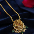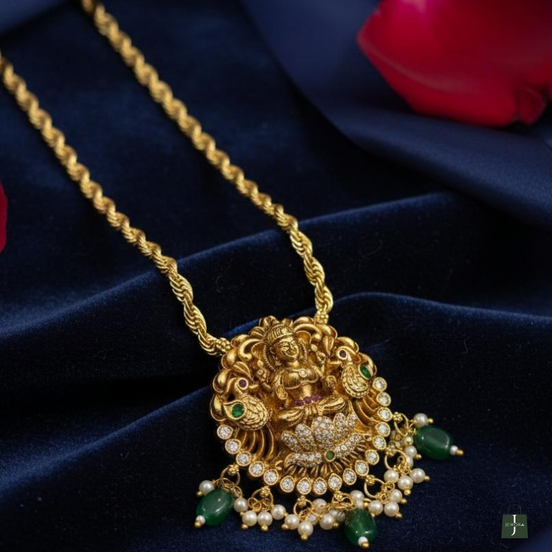 This exquisite temple-style pendant features a beautifully detailed central icon of Goddess Lakshmi, the symbol of wealth and prosperity. The goddess is depicted in a traditional seated pose, surrounded by a radiant, ornate golden halo and flanked by auspicious peacock motifs.