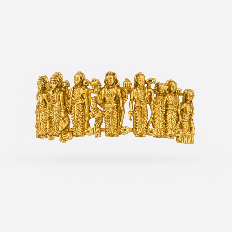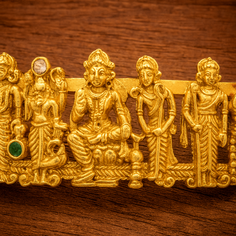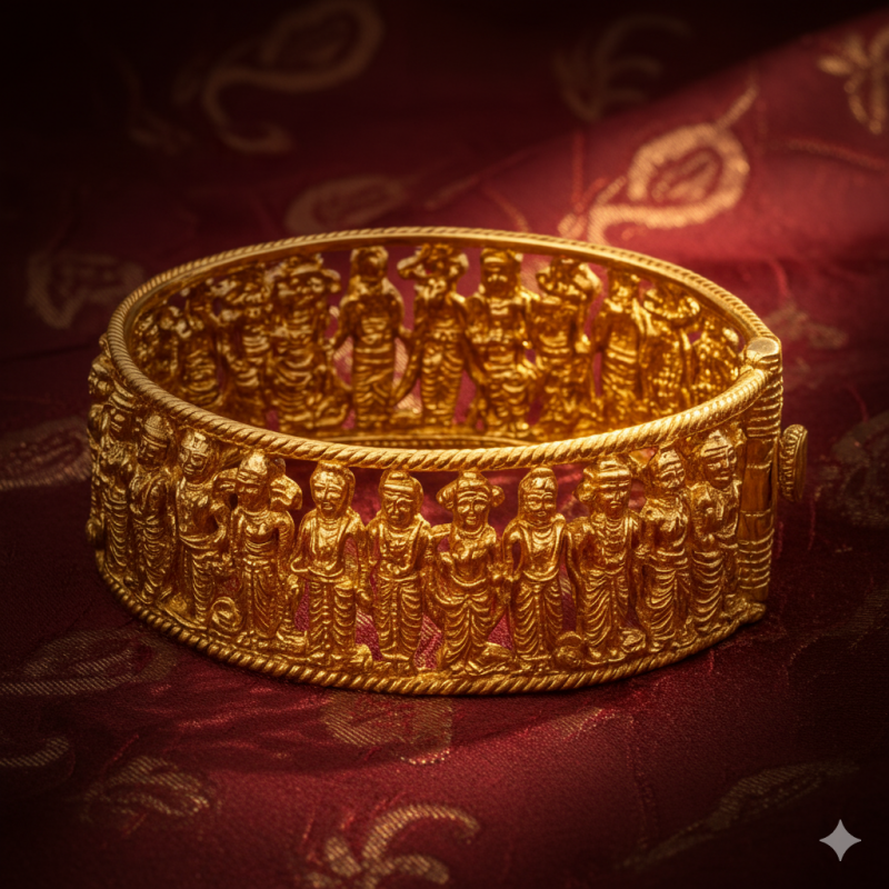Celebrate tradition with the Divine Lord Ram Temple Kada Bangle, a masterpiece of temple artistry. Crafted in rich gold polish, this kada showcases intricate carvings of Lord Ram and temple-inspired motifs, symbolizing divinity and cultural heritage. Perfect for brides and festive occasions, this statement piece adds a touch of spirituality and grandeur to your jewellery collection.