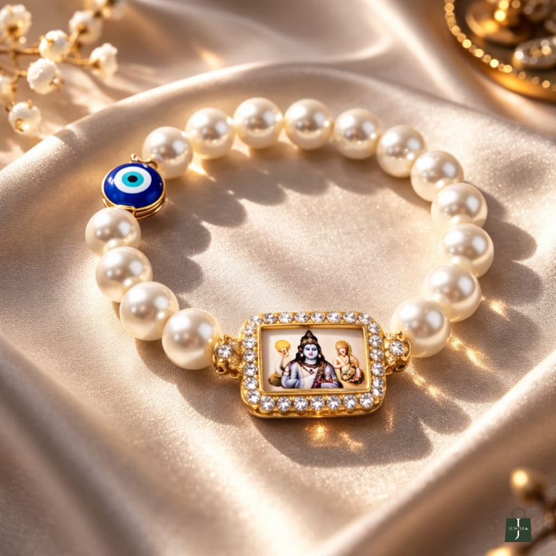 A graceful pearl bracelet designed with a sacred Shiv Parivar charm and protective evil eye bead, symbolizing blessings, positivity, and spiritual protection. The luminous pearls paired with gold-toned detailing create a perfect blend of devotion and elegance.