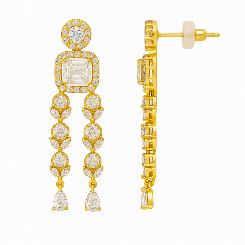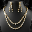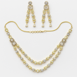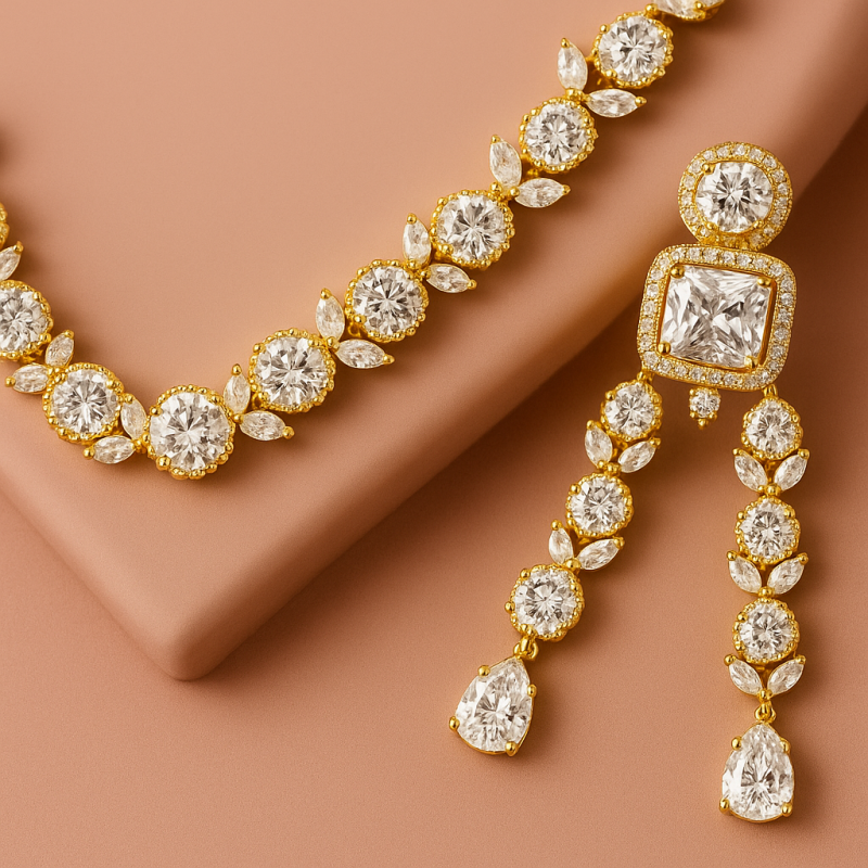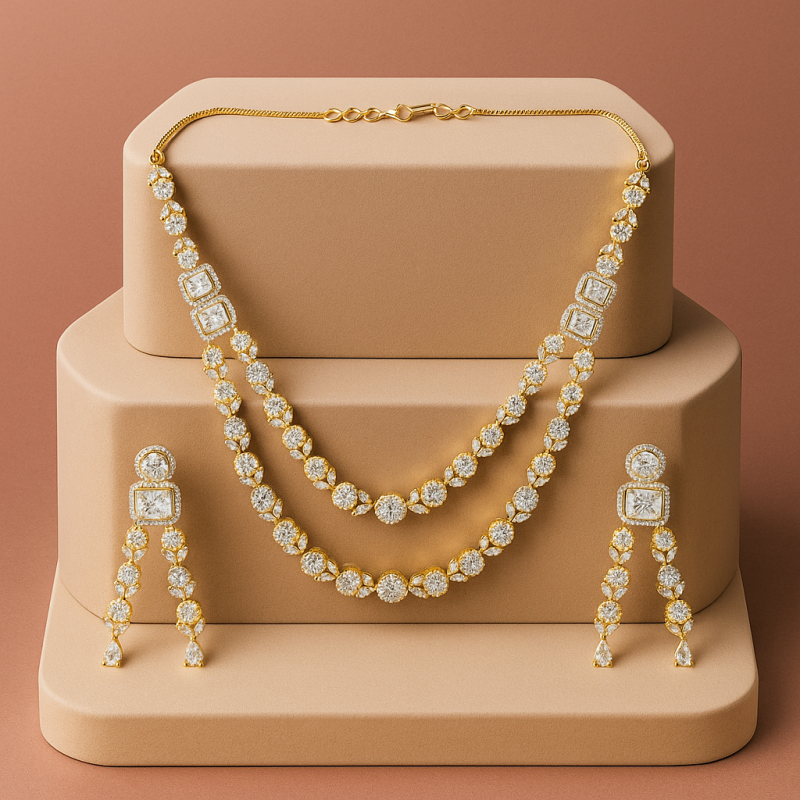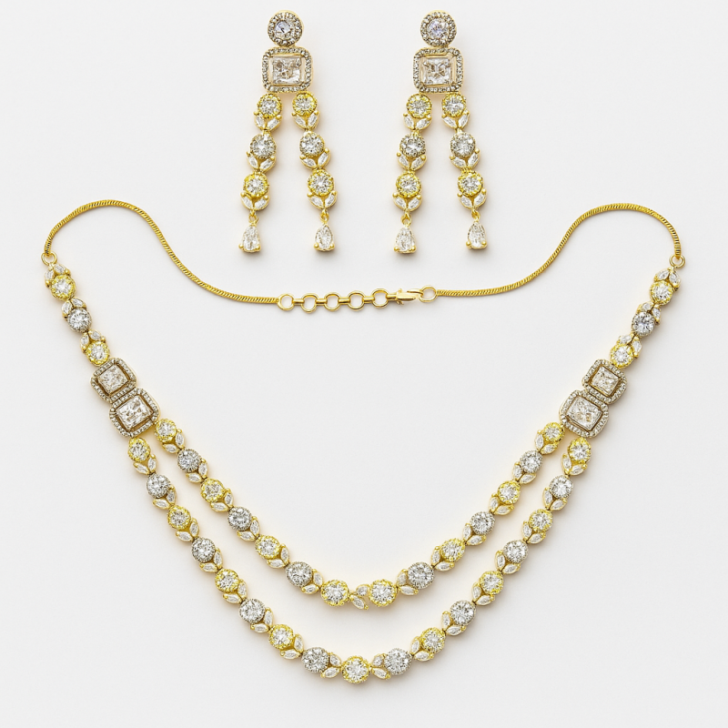 Elevate your elegance with this luxurious double-layered choker set, designed with sparkling American Diamonds and finished in radiant gold polish. The two-tier necklace combines round-cut stones with rectangular diamond clusters, creating a balanced fusion of classic and modern design. Matching long drop earrings add a glamorous touch, making this set a perfect pick for weddings, receptions, and festive evenings. Its dazzling brilliance ensures you stand out at every occasion, while the refined craftsmanship gives it a premium finish. This timeless choker set is ideal for brides or anyone looking to make a statement with a bold yet sophisticated piece of jewelry.