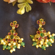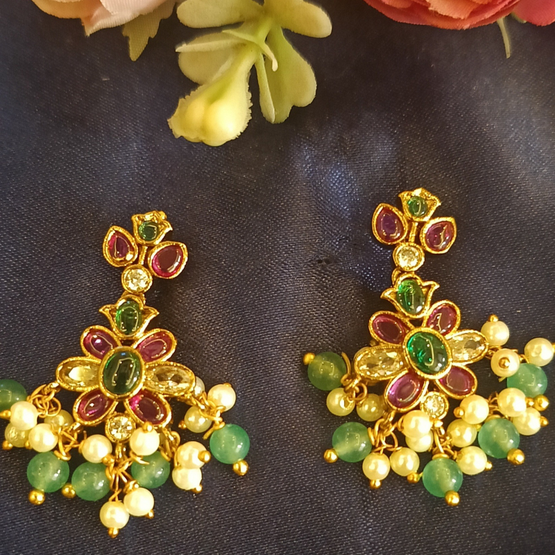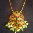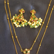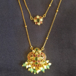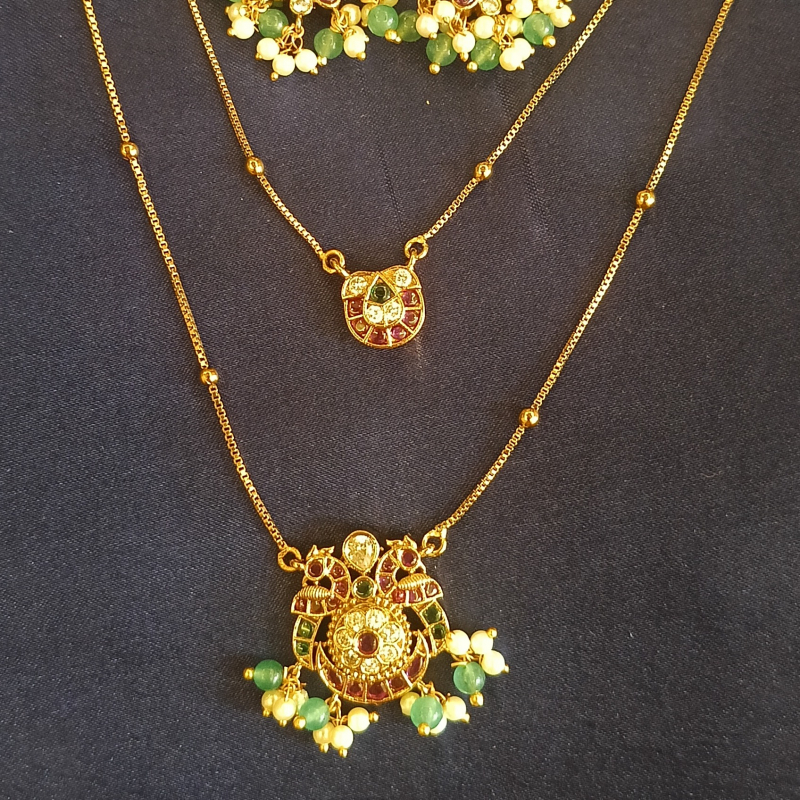 This is a gold-plated Multi layered necklace featuring a Jadau pendant adorned with pink and green stones and beaded dangles.The Earrings are beautifully crafted to match with the pendant .The combination of Neckset with earrings complements Sarees,Lehengas,Salwars and even shararas..