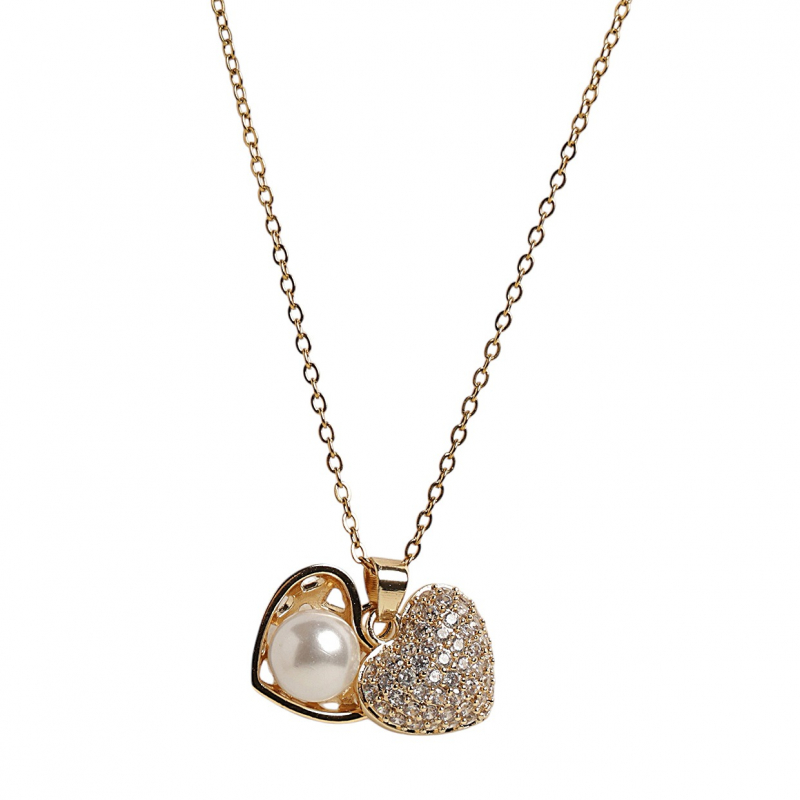 Add a touch of elegance and romance to your look with this beautifully crafted dual heart pendant necklace. Featuring two charming heart motifs—one adorned with a lustrous pearl and the other embellished with shimmering zircon stones—this piece perfectly blends classic and modern style. The sleek gold-tone chain enhances its luxurious appeal, making it ideal for both everyday wear and special occasions. A perfect accessory for those who love subtle yet stylish jewelry.