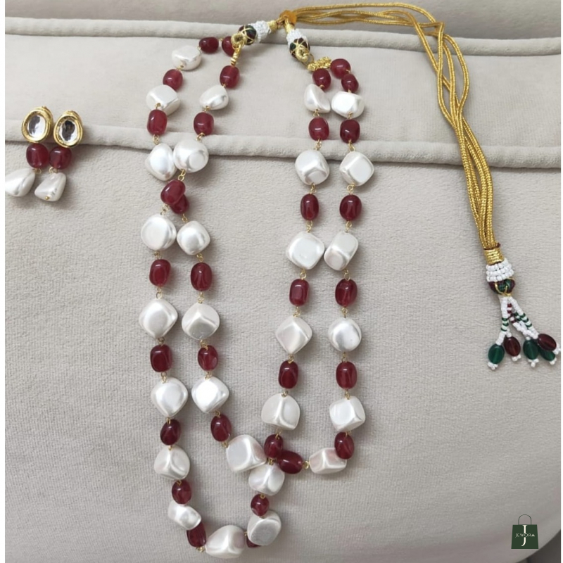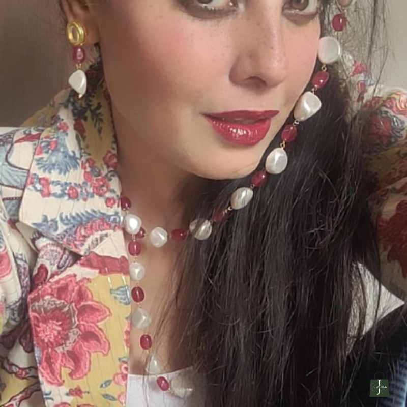 This is a dual-strand pearl and ruby-tone beaded necklace set with coordinated drop earrings, designed in a refined, contemporary-traditional aesthetic.
