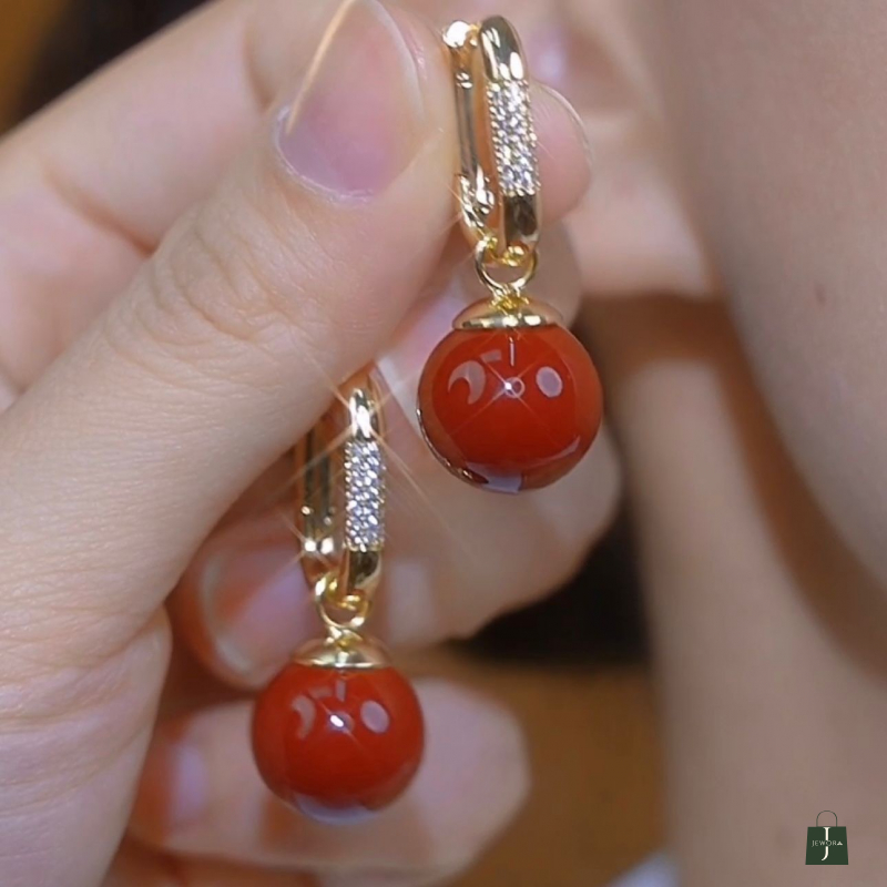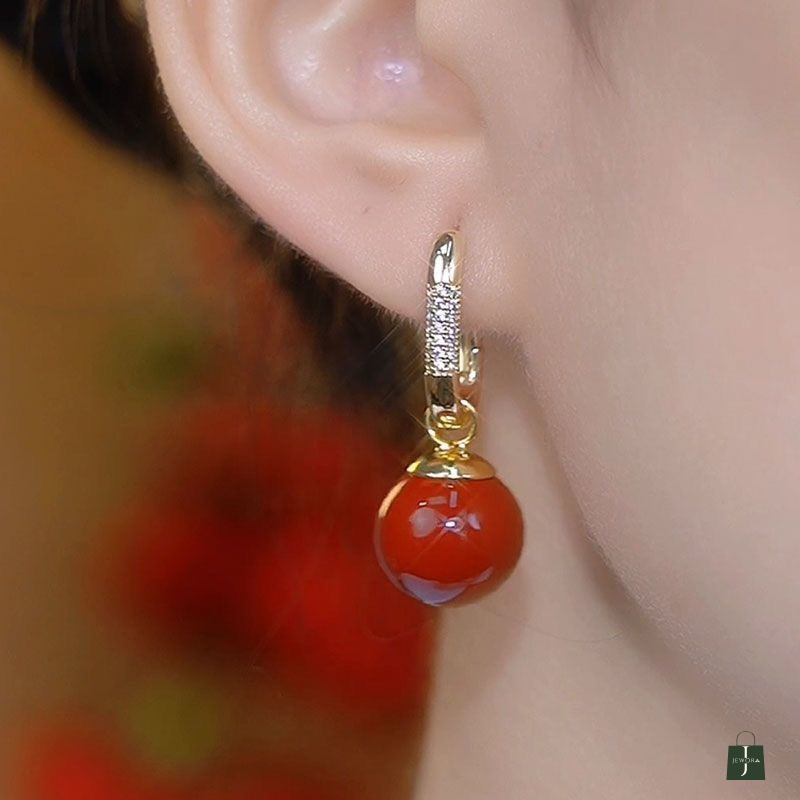 These stunning gold hoop earrings feature an elegant dangle design that effortlessly combines classic sophistication with contemporary style. Each earring showcases a beautifully polished hoop adorned with sparkling crystal pavé detailing that catches the light from every angle. The secure hoop closure ensures comfortable all-day wear whilst maintaining a sleek profile against the ear. What truly sets these earrings apart is the choice of interchangeable drops – lustrous pearl drops that exude timeless elegance, or vibrant agate stones in rich coral-red tones that add a bold pop of colour to any ensemble. The smooth, glossy finish of both drop options creates a luxurious look that transitions seamlessly from day to evening wear. The dangle style adds graceful movement and draws attention to the face, making these earrings perfect for special occasions, professional settings, or elevating your everyday wardrobe. The combination of gold-tone metal, shimmering crystals, and your choice of natural stone or pearl creates a versatile accessory that complements both traditional and modern outfits. These earrings make an excellent gift for someone special or a well-deserved addition to your own jewellery collection.