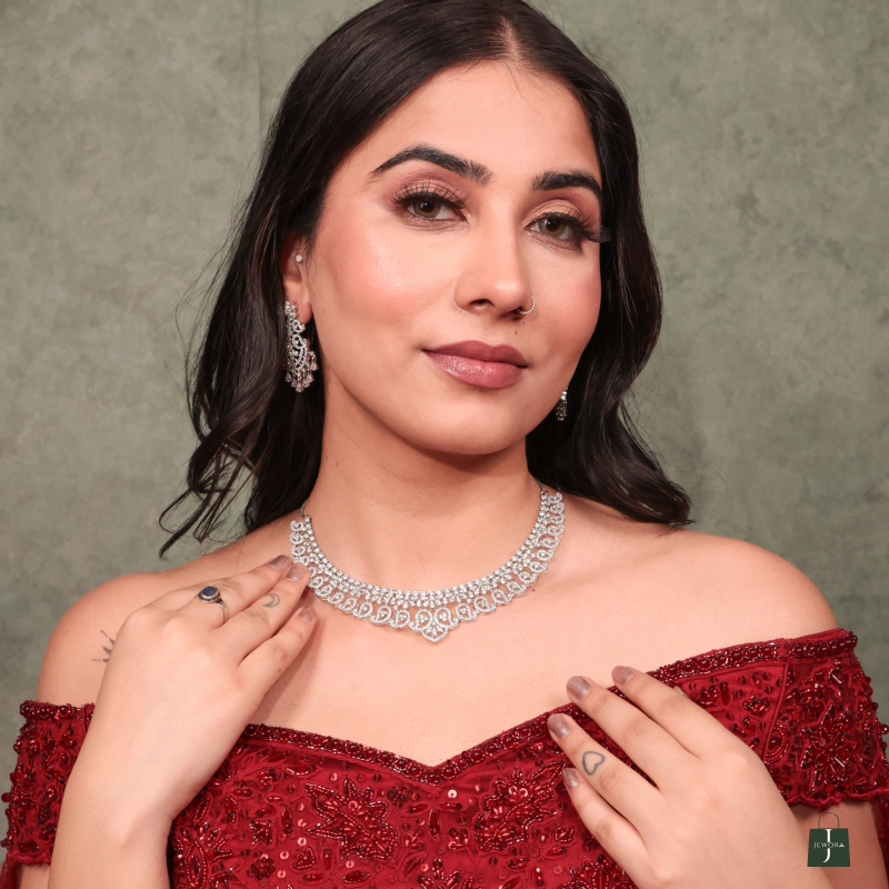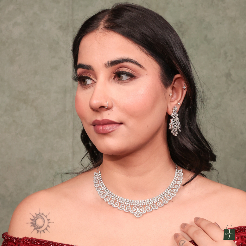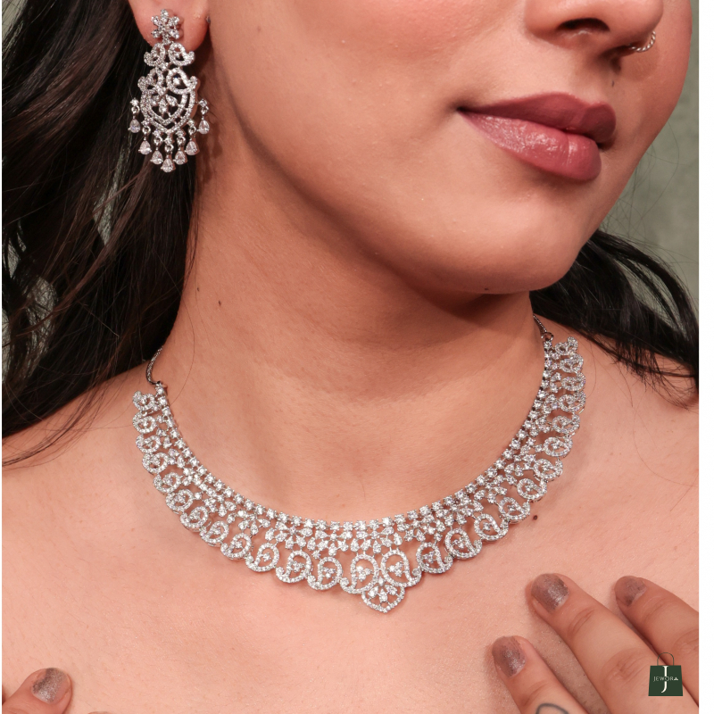 Channel timeless glamour with the Eira Frost CZ Bridal Choker Set, a stunningly crafted masterpiece designed to turn heads at every celebration. Encrusted with radiant cubic zirconia stones in an intricate swirl-and-drop pattern, this silver-toned choker set exudes regal elegance and contemporary charm.