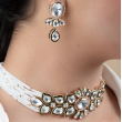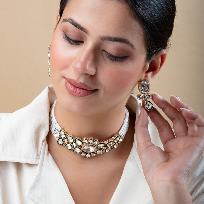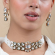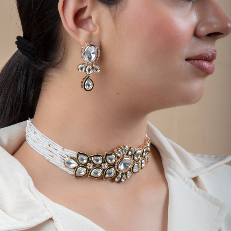 The jewelry is an elegant Kundan and Pearl Choker Set with matching earrings, reflecting traditional Indian craftsmanship with a modern touch.The pear-shaped and oval Kundan stones are arranged symmetrically, with a large central stone.