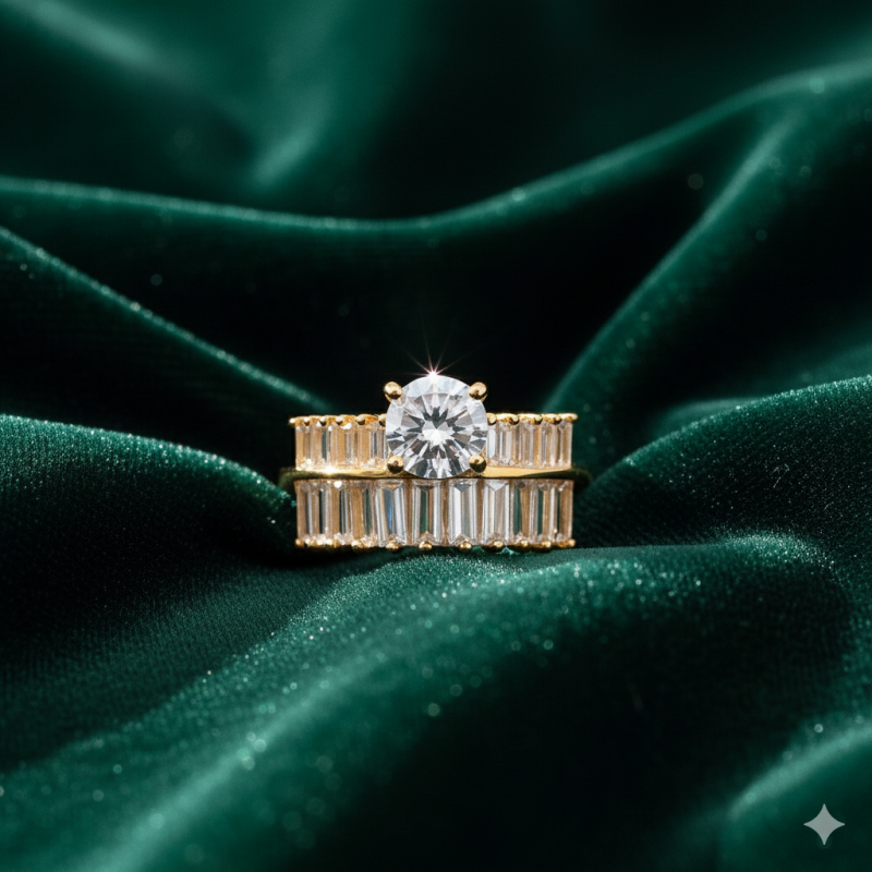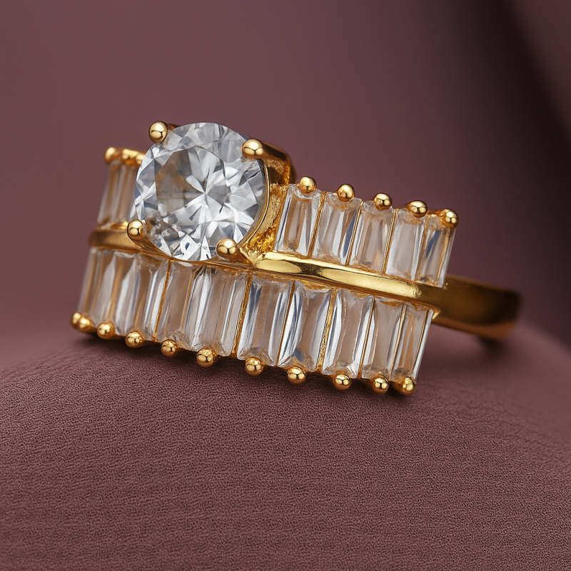 Elegant AD Baguette Solitaire Ring is a sophisticated jewellery piece that combines modern design with timeless brilliance. The centerpiece features a striking solitaire American Diamond (CZ), beautifully framed with baguette-cut accents along the band for an elegant, refined look. Its minimal yet luxurious appeal makes it versatile for both daily wear and grand occasions.