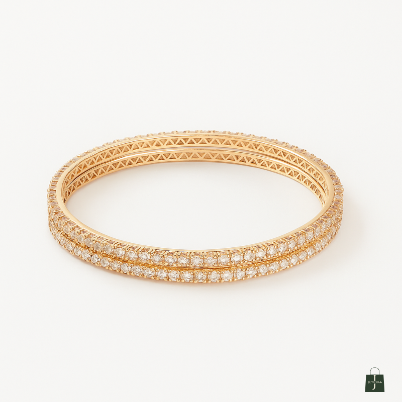 The Elegant AD Bangles are the epitome of timeless sophistication, designed for women who appreciate a perfect blend of simplicity and sparkle. Crafted with a refined gold polish, these bangles feature a slim, lightweight profile that makes them easy to wear throughout the day while still exuding luxury. Each bangle is embellished with a continuous line of finely set American Diamond (CZ) stones, offering a radiant shimmer with every movement. The meticulous stone placement ensures maximum brilliance, making these bangles suitable for both festive occasions and chic evening outings. Their minimalistic yet elegant design allows them to pair seamlessly with traditional attire like sarees, lehengas, and salwar suits, as well as contemporary outfits such as cocktail dresses and evening gowns. The set of two makes for a versatile accessory that can be worn alone for understated elegance or stacked with other jewelry for a more extravagant look. Durable, stylish, and graceful, the Elegant Gold AD Bangles are a must-have addition to every woman’s jewelry collection, perfect for enhancing both everyday ensembles and special-occasion outfits.