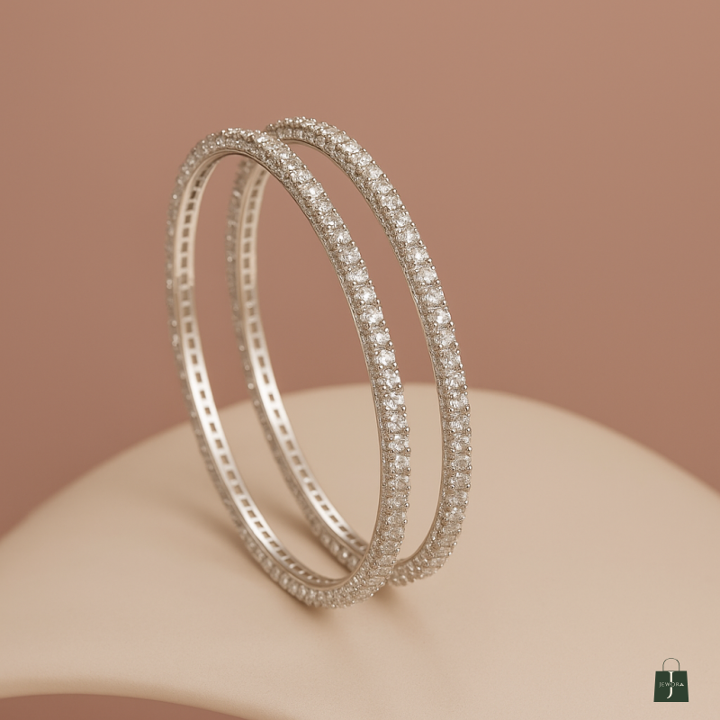 The Elegant AD Bangles are the epitome of timeless sophistication, designed for women who appreciate a perfect blend of simplicity and sparkle. Crafted with a refined gold polish, these bangles feature a slim, lightweight profile that makes them easy to wear throughout the day while still exuding luxury. Each bangle is embellished with a continuous line of finely set American Diamond (CZ) stones, offering a radiant shimmer with every movement. The meticulous stone placement ensures maximum brilliance, making these bangles suitable for both festive occasions and chic evening outings. Their minimalistic yet elegant design allows them to pair seamlessly with traditional attire like sarees, lehengas, and salwar suits, as well as contemporary outfits such as cocktail dresses and evening gowns. The set of two makes for a versatile accessory that can be worn alone for understated elegance or stacked with other jewelry for a more extravagant look. Durable, stylish, and graceful, the Elegant Gold AD Bangles are a must-have addition to every woman’s jewelry collection, perfect for enhancing both everyday ensembles and special-occasion outfits.