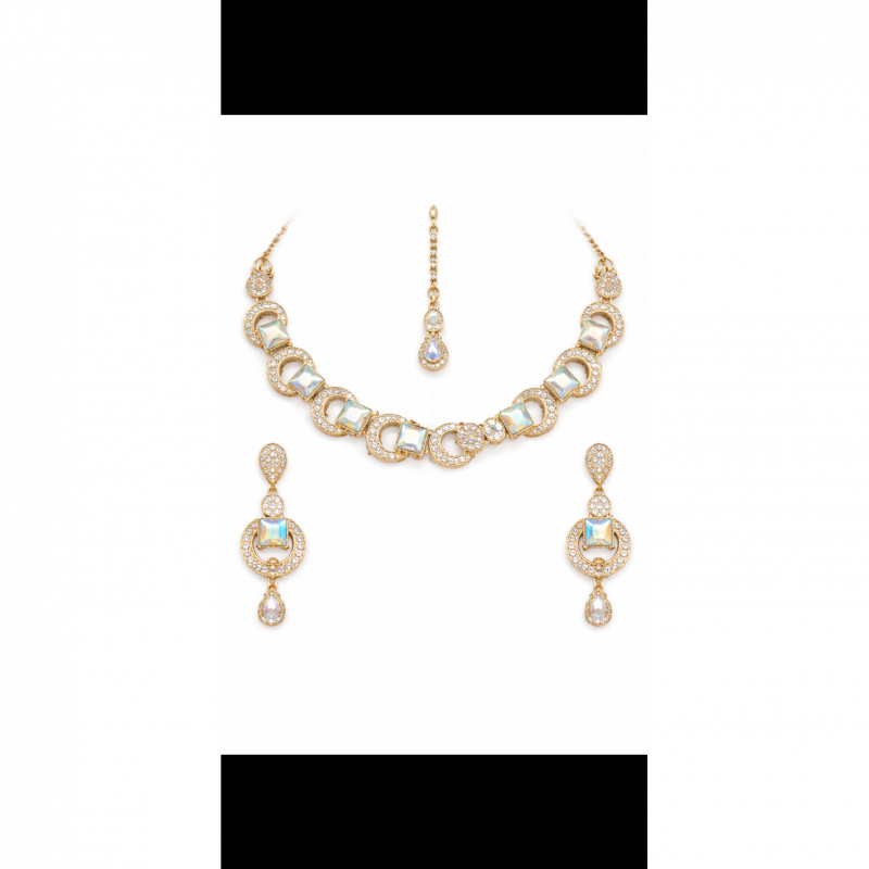 Elegant American Diamond Necklace Set with Earrings & Maang Tikka | Bridal Party Jewellery Set
