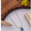 This stunning gold-tone pendant necklace is a perfect blend of modern elegance and timeless charm. Featuring a square-shaped pendant with softly rounded edges, the necklace showcases a beautiful blue glossy center that adds a refreshing pop of color to the design. The smooth, polished gold frame enhances the vibrant hue, creating a sophisticated contrast that draws attention effortlessly.