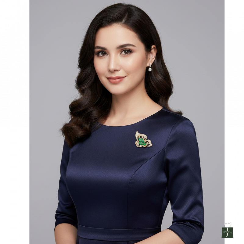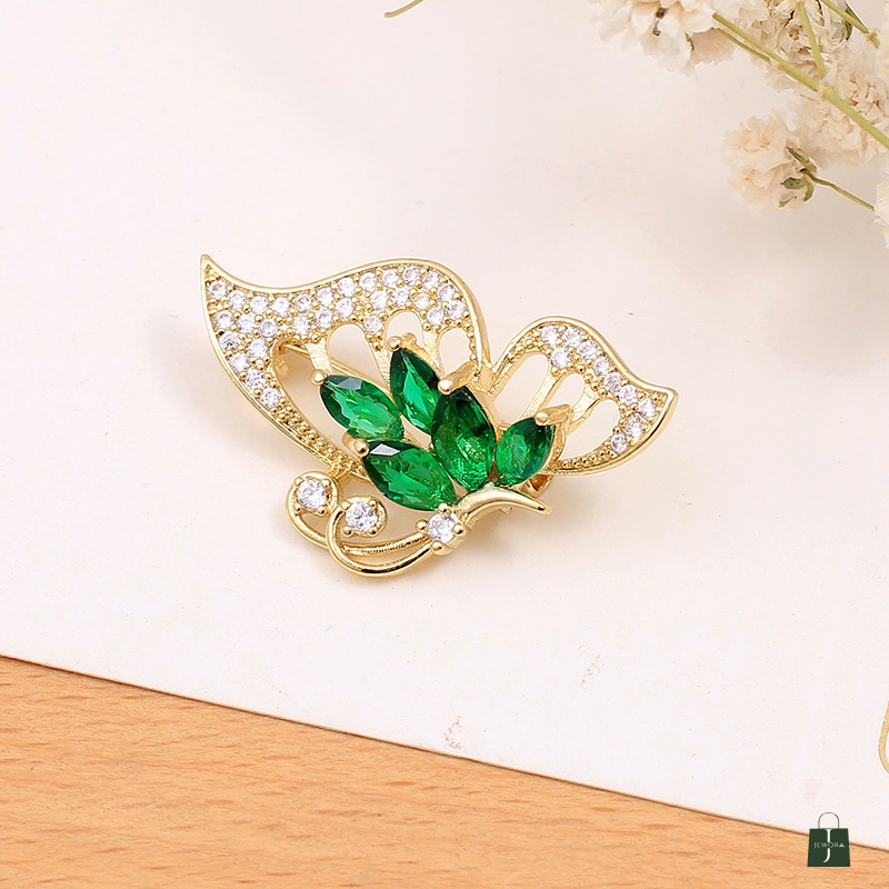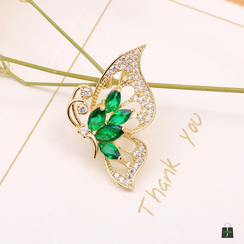 DESIGN FEATURES: Exquisite butterfly-shaped brooch with emerald green crystal accents and gold-plated finish, perfect for adding elegance to any outfit