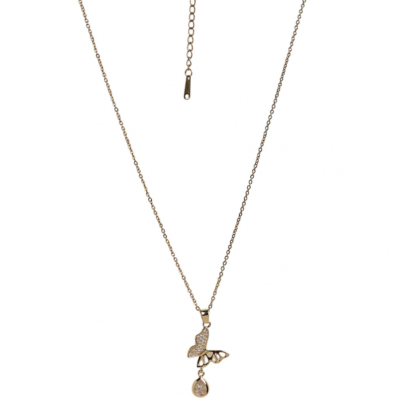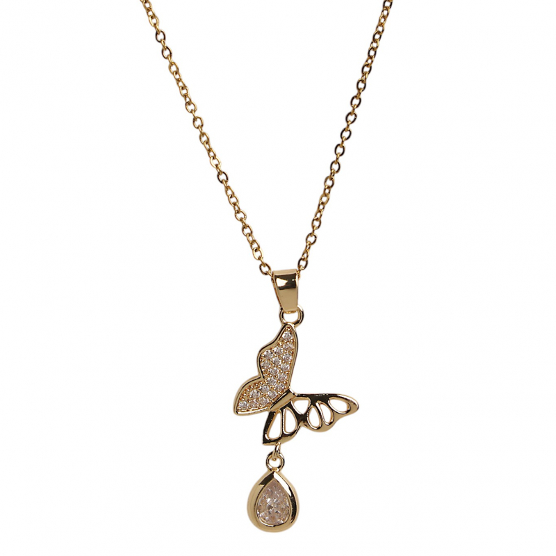 Enhance your elegance with this beautifully designed butterfly drop pendant necklace. Featuring a delicate butterfly motif adorned with shimmering zircon stones and a graceful teardrop crystal hanging below, this piece exudes charm and femininity. The sleek gold-tone finish adds a luxurious touch, making it perfect for both everyday wear and special occasions. Lightweight and stylish, this necklace is ideal for adding a subtle sparkle to any outfit.