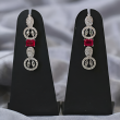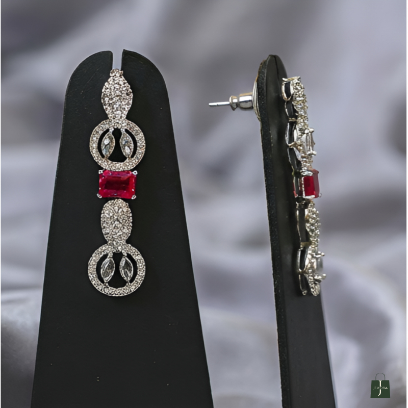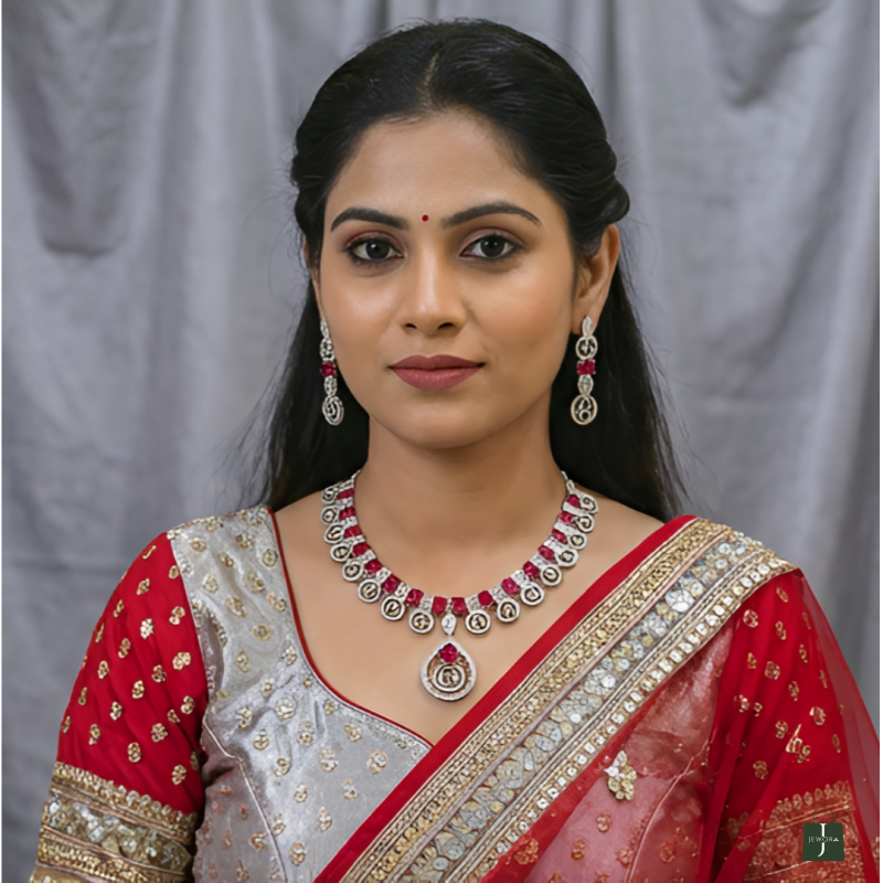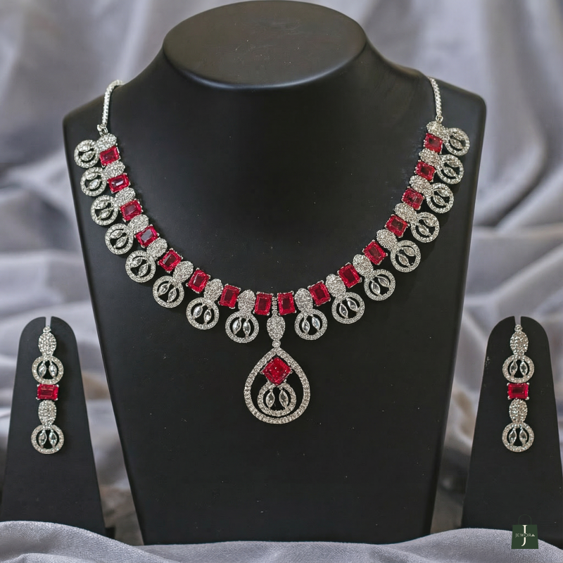 Design: Elegant collar necklace featuring alternating circular motifs and ruby-red rectangular stones adorned with American Diamonds throughout. The teardrop pendant showcases a ruby centerpiece with circular AD detailing. The matching three-tier drop earrings mirror the same circular and ruby design for a cohesive glamorous look.