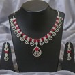 Elevate your ethnic look with this Elegant Circular Ruby American Diamond Necklace & Earrings Set. This exquisite imitation jewellery set features intricate circular motifs and stunning ruby stones, perfect for weddings and festive occasions.