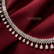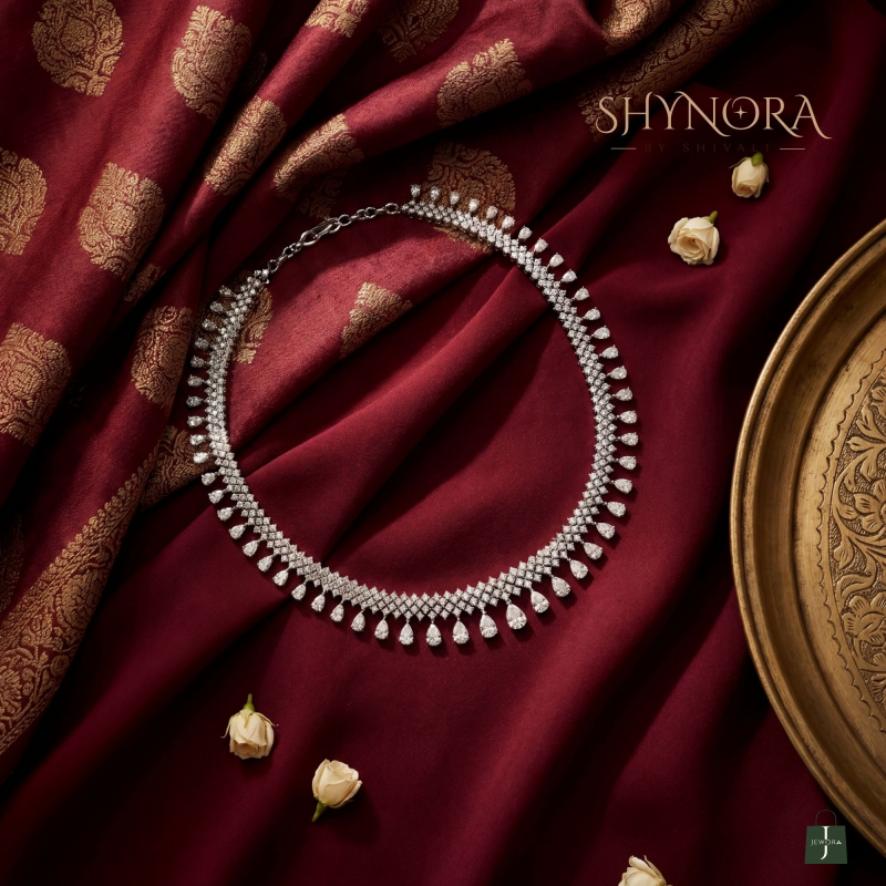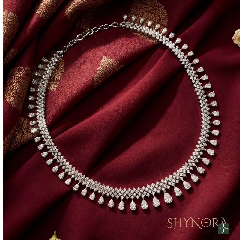 The highlight of the piece is the series of pear-shaped diamond drops that dangle beautifully along the neckline, creating graceful movement and luxurious shine. Lightweight yet eye-catching, this choker is perfect for modern brides, cocktail events, and evening celebrations.