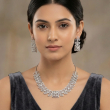 Elevate your look with this exquisite diamond-style necklace and earring set, crafted to make a lasting impression at weddings, galas, anniversaries, and formal occasions. The stunning necklace features an elegant leaf-motif design adorned with sparkling crystal stones set in a lustrous silver tone finish, gracefully framing the neckline. The matching drop earrings mirror the necklace's intricate design, showcasing a beautiful square centrepiece surrounded by delicate leaf-shaped accents encrusted with shimmering stones. This 3-piece jewellery set is finished with a high-polish rhodium-plated setting, ensuring a brilliant, long-lasting shine. The necklace measures 45 centimetres in length and features a secure lobster claw clasp for ease of wear. With approximately 50 stones set in a halo design, this set radiates timeless sophistication. Perfect as a gift for birthdays, engagements, Valentine's Day, or as a well-deserved treat for yourself. Pair it with an evening gown or a classic saree for a truly show-stopping ensemble.