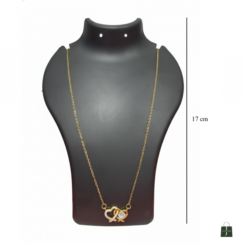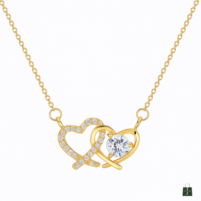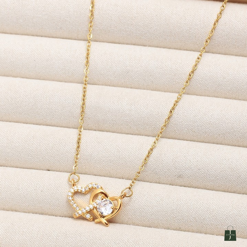 Elevate your jewellery collection with this exquisite double heart crystal necklace. The delicate design features two intertwined hearts - one adorned with sparkling rhinestones and the other showcasing a stunning central crystal, both crafted with meticulous attention to detail. The pendant is suspended on a sophisticated gold-plated chain that adds a touch of luxury to any outfit. Perfect for both everyday wear and special occasions, this necklace makes a meaningful gift for someone special or a beautiful treat for yourself. The versatile design complements both casual and formal attire, while the high-quality plating ensures a lasting shine. The secure clasp keeps the necklace firmly in place, allowing you to wear it with confidence. This charming piece symbolises love and connection, making it an ideal choice for romantic gestures or celebrating cherished relationships.