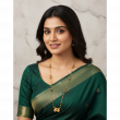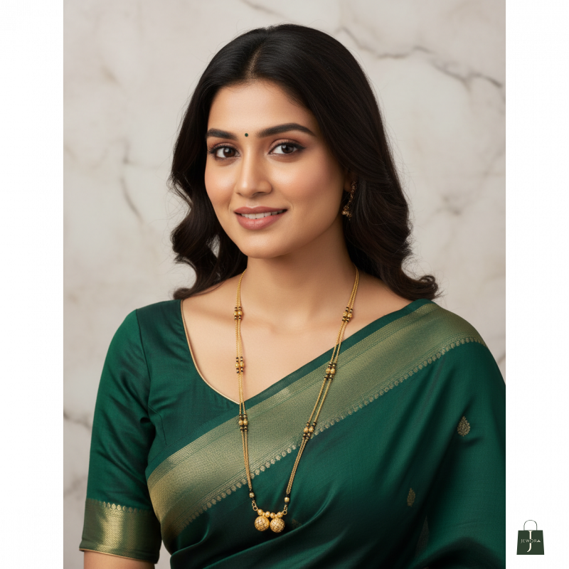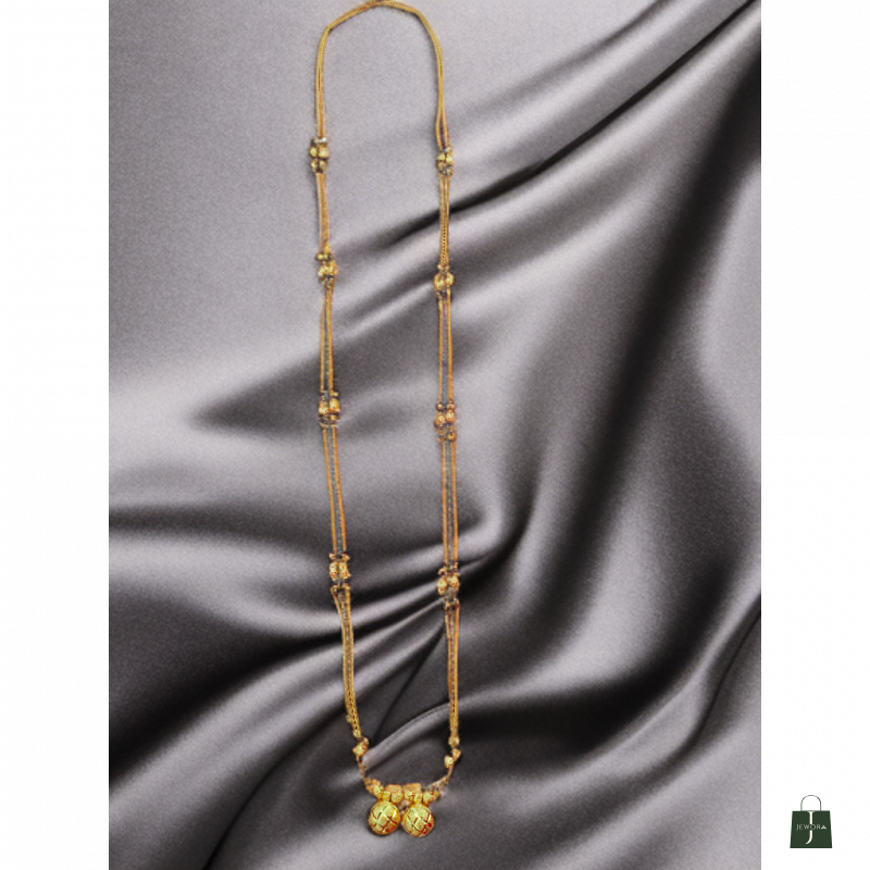 This beautiful double-strand mangalsutra features a classic gold-tone finish with finely detailed beadwork that highlights traditional elegance. The dual-layer chain is adorned with decorative gold beads and two intricate spherical pendants that add charm and sophistication. Lightweight and graceful, it pairs perfectly with sarees and ethnic wear, making it ideal for daily use or special occasions. A timeless piece crafted to enhance your traditional look.
