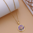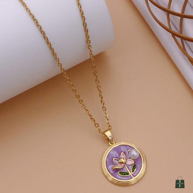 Embrace timeless floral elegance with this beautifully crafted round enamel pendant necklace. Featuring a soft lavender-purple enamel base, the pendant is adorned with a delicate gold-tone flower motif and tiny green leaf accents, creating a graceful and feminine design inspired by nature’s beauty.