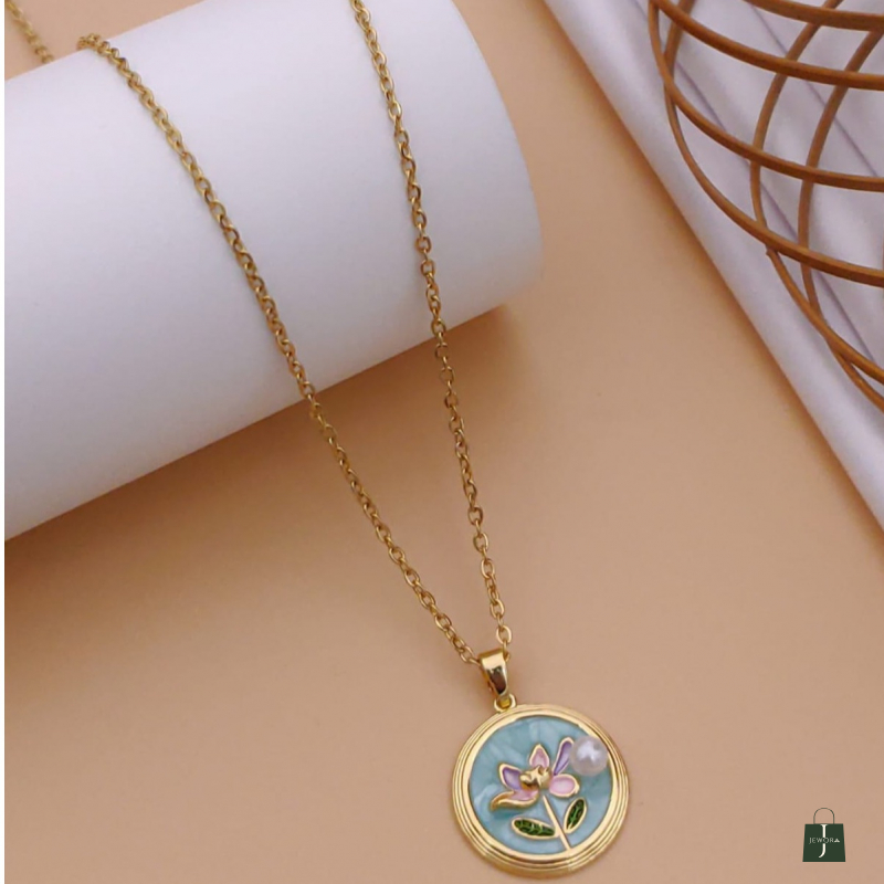 Bring a refreshing touch of elegance to your everyday style with this charming gold-tone floral pendant necklace. Designed with a sleek and delicate chain, this necklace features a round pendant highlighted with a soft pastel blue enamel base that creates a calm and soothing look. At the center, a beautifully crafted floral motif in subtle shades of pink and green adds a graceful and feminine touch, while a tiny pearl-like accent enhances its delicate charm.