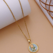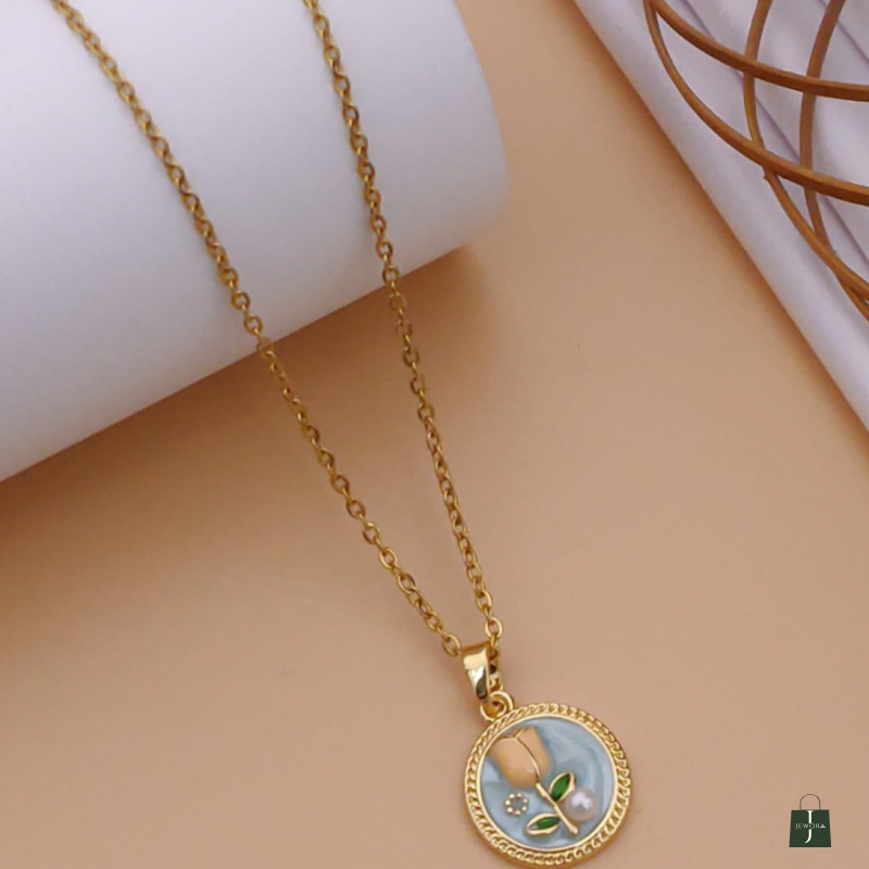 Elevate your everyday style with this elegant round pendant necklace, designed to bring a soft and graceful charm to any look. The pendant features a soothing light blue enamel background, beautifully complemented by a delicate floral motif with green leaf accents and a pearl-style detail at the center. The design symbolizes freshness, harmony, and natural beauty, making it a meaningful accessory for daily wear.