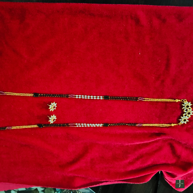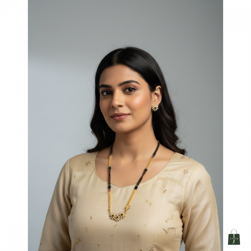 This elegant dual-strand mangalsutra set features a beautifully crafted floral pendant adorned with sparkling stones for a refined, traditional look. The design combines classic black beads with golden chains, highlighted by subtle colored bead accents. Perfect for daily wear or special occasions, it adds a touch of grace to any outfit. The matching floral stud earrings complete the set, making it an ideal choice for modern brides and women who love timeless jewellery.