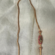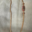 A stunning gold-toned necklace featuring a delicate, flexible chain with a beautiful side pendant. The pendant is adorned with sparkling stones arranged in a floral design, highlighted by subtle pink accents that add a touch of elegance. Ideal for everyday wear or special occasions, this piece combines classic craftsmanship with modern sparkle.