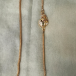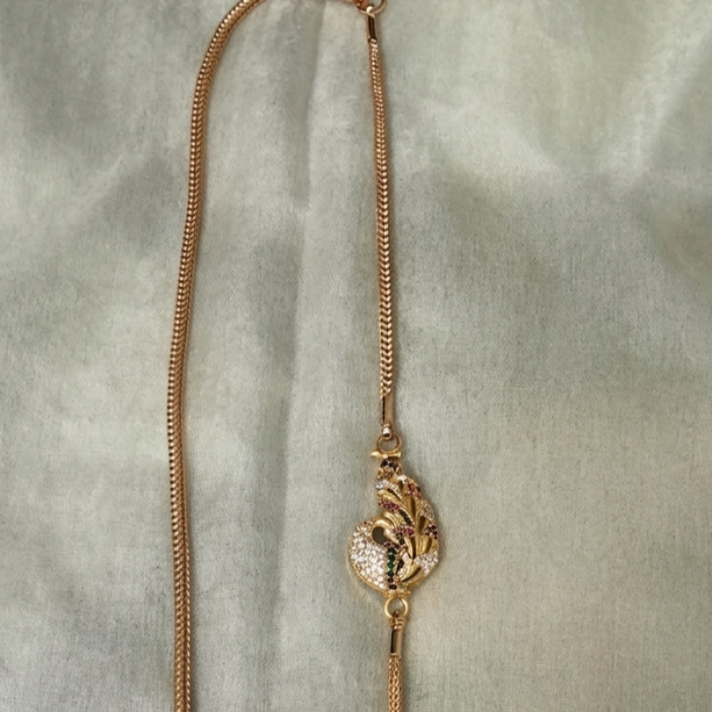 A stunning gold-toned necklace featuring a delicate, flexible chain with a beautiful side pendant. The pendant is adorned with sparkling stones arranged in a floral design, highlighted by subtle pink accents that add a touch of elegance. Ideal for everyday wear or special occasions, this piece combines classic craftsmanship with modern sparkle.