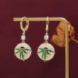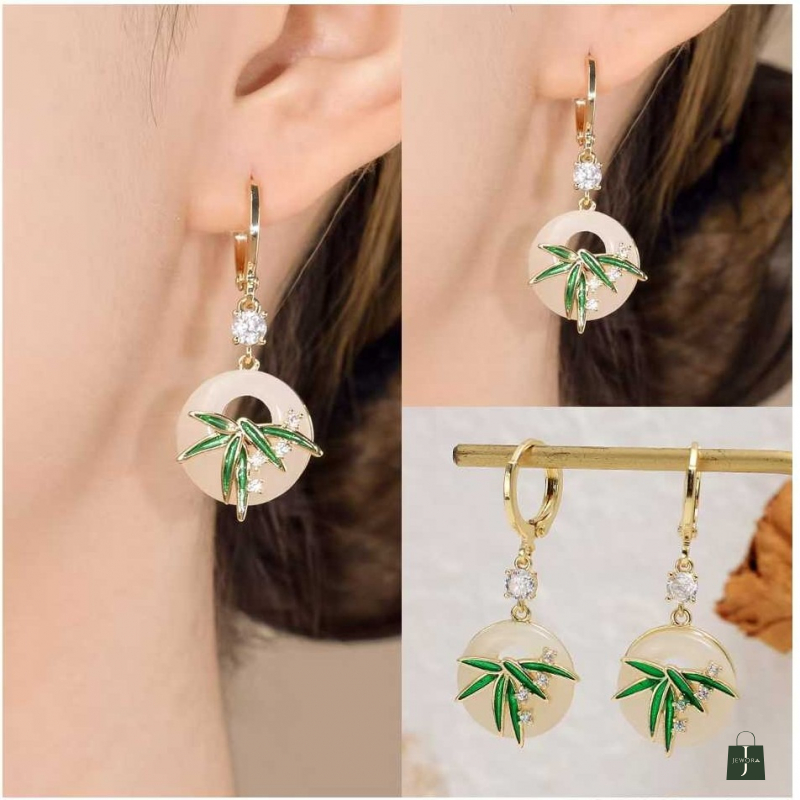 🌿 Elegant Bamboo & Jade Drop Earrings These stunning drop earrings blend nature-inspired symbolism with sparkling elegance. They feature a serene jade-look disc beautifully accented with an artistic green enamel bamboo leaf motif and bright cubic zirconia (CZ) stones. A sparkling CZ stud connects the design to secure, comfortable lever back clasps. Perfect for adding a refined, sophisticated touch to any outfit, these earrings symbolize strength and longevity.