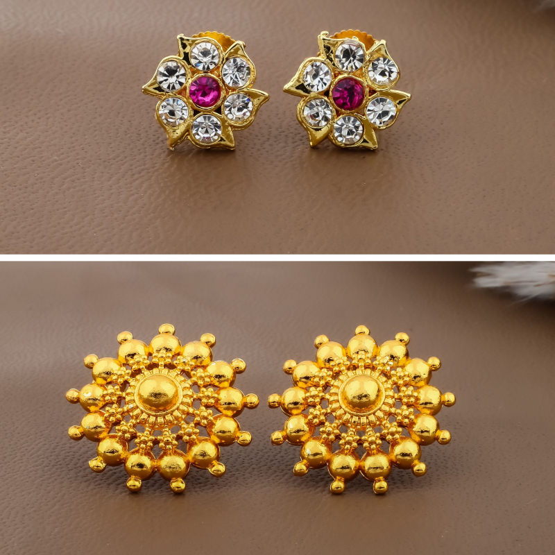 Add a touch of elegance to your jewellery collection with this beautiful combo of two pairs of gold-polish stud earrings. One pair features a delicate floral star design embellished with sparkling white crystals and a vibrant pink center stone. The second pair showcases a classic sunburst-inspired design crafted with detailed bead work and a rich gold finish. These lightweight earrings combine traditional charm with modern sparkle, making them perfect for festive occasions, parties, weddings, and everyday ethnic styling.