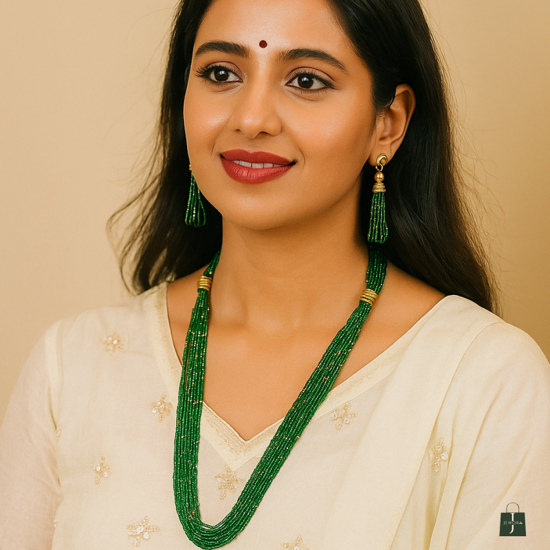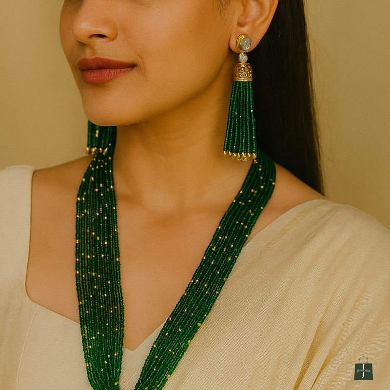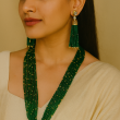 A true statement piece, this necklace set beautifully complements sarees, lehengas, and even Indo-western outfits. Its vibrant green hues and intricate detailing make it a must-have addition to your festive jewelry collection.