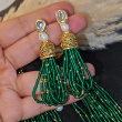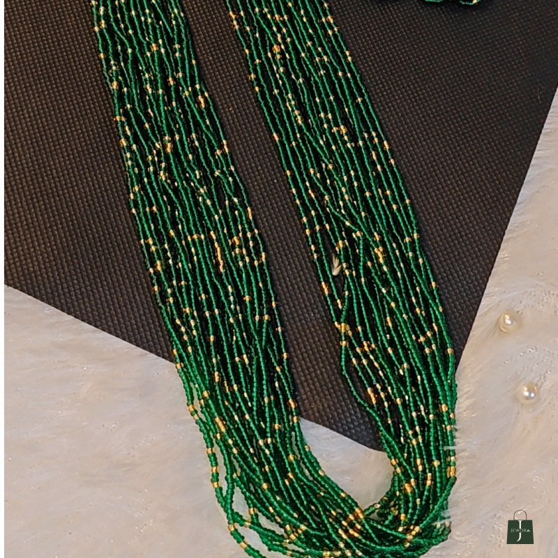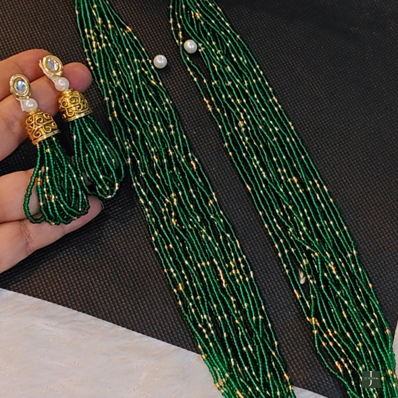 Enhance your festive look with this exquisite green and gold layered beaded necklace set, a perfect blend of traditional artistry and modern sophistication. Crafted with multiple strands of fine green seed beads interspersed with delicate golden beads, this necklace exudes timeless elegance.