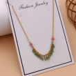 Bring effortless elegance to your everyday look with this beautifully crafted gold-tone beaded necklace. Designed with a fine, lightweight chain, this piece features soft pink accent beads on both sides that lead to a graceful curved arrangement of tiny green beads finished with delicate gold drops. The balanced mix of pastel pink, refreshing green, and warm gold tones creates a charming and eye-catching design.