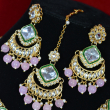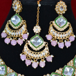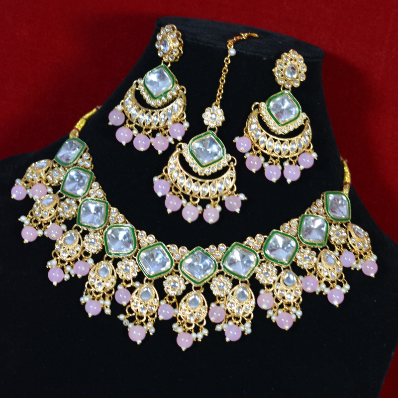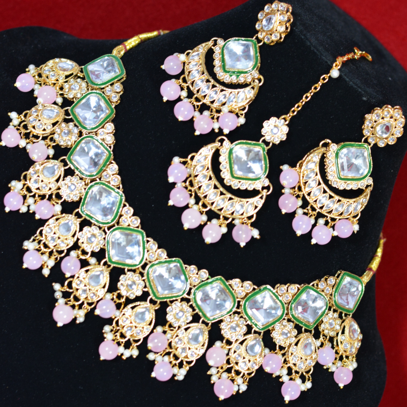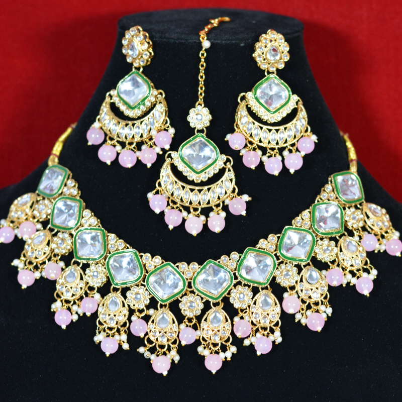 This necklace set combines clear kundan stones with soft green enamel detailing in a graceful, symmetrical layout. Pink drop beads add a delicate pop of color, enhancing the overall elegance. The smooth stone finish, fine pearl accents, and balanced design create a refined look suited for both bridal and festive wear.