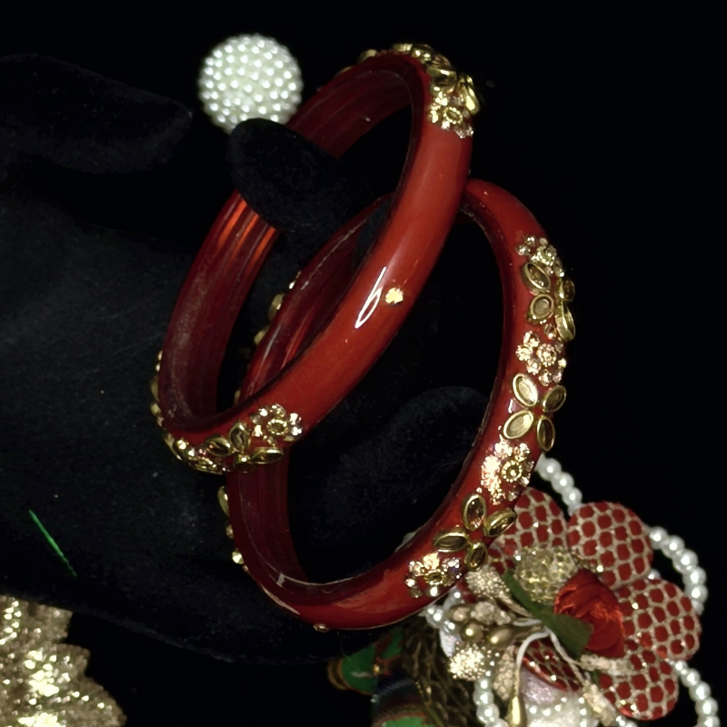 This beautiful bangles set features a classic blend of kundan-style stones and delicate pearl detailing, giving it a rich and traditional appeal. Crafted with a gold-polish finish, these bangles are perfect for enhancing your ethnic look. The intricate design and elegant shine make them suitable for weddings, festive occasions, and party wear. Comfortable to wear and stylish in appearance, this set adds a graceful charm to any outfit.