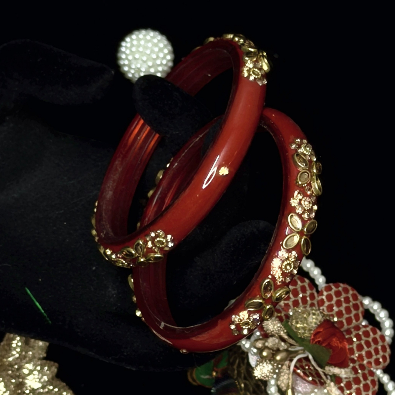 This beautiful bangles set features a classic blend of kundan-style stones and delicate pearl detailing, giving it a rich and traditional appeal. Crafted with a gold-polish finish, these bangles are perfect for enhancing your ethnic look. The intricate design and elegant shine make them suitable for weddings, festive occasions, and party wear. Comfortable to wear and stylish in appearance, this set adds a graceful charm to any outfit.