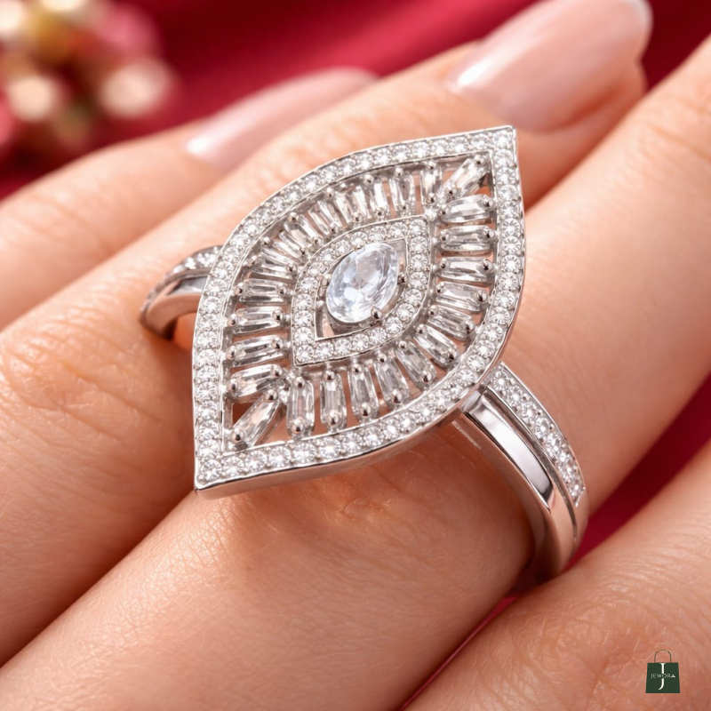Inspired by nature’s beauty, this Leaf Shape Swarovski Crystal Zircon Ring is a true statement of elegance and sparkle. Designed in a graceful marquise (leaf) shape, it features a brilliant Swarovski crystal at the center, surrounded by finely set zircon stones that enhance its luxurious shine.