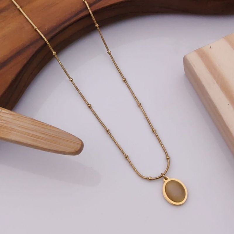 This refined gold pendant necklace is a beautiful expression of minimal luxury and everyday elegance. Featuring a sleek oval-shaped charm with a smooth, glossy center, the pendant is framed in a polished gold-tone setting that adds a warm, sophisticated glow. The delicate chain is accented with subtle bead details along its length, creating a unique textured look that enhances the overall design.
