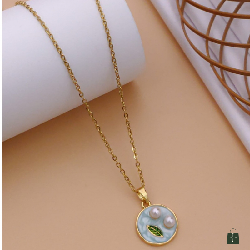 Elevate your everyday style with this elegant minimalist round pendant necklace, designed to bring a fresh and graceful touch to your jewelry collection. The necklace features a fine gold-tone chain paired with a delicate circular pendant finished in a soft pastel enamel shade. At the center, two pearl-style accents add a subtle shimmer, while a tiny green leaf motif introduces a natural, refreshing charm.